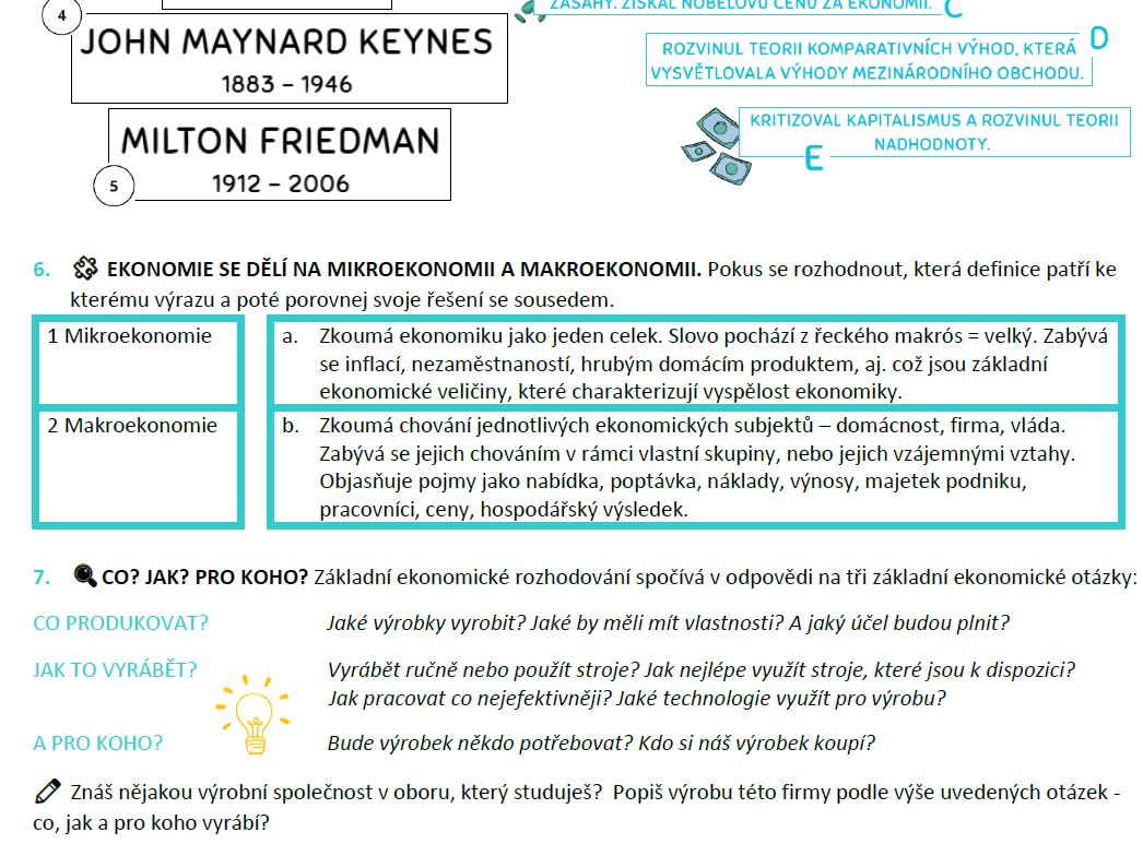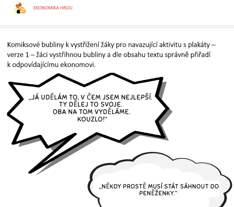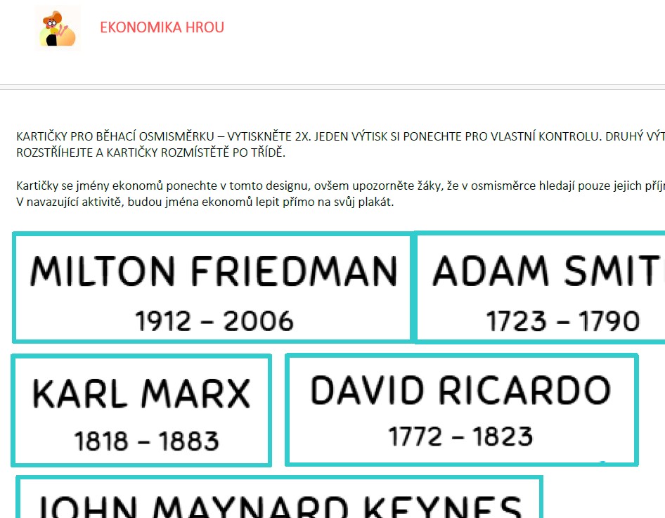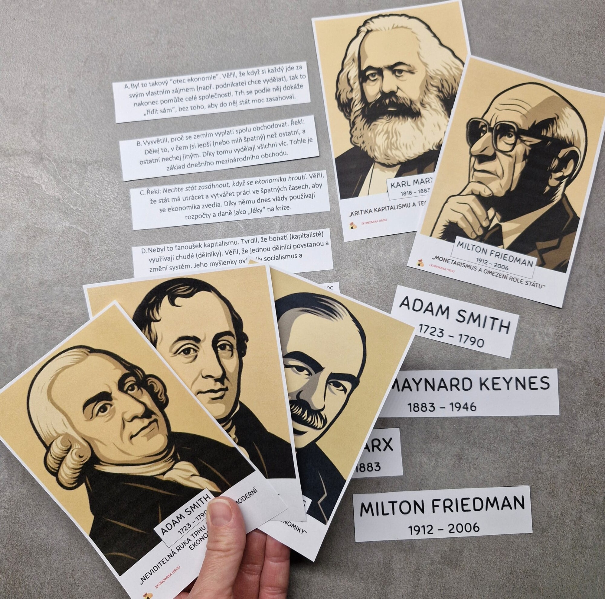 Druhá varianta: Zahrnuje sice i nějakou tu přípravu, ovšem zaručeně vaše žáky rozproudí a výuku oživí. Tato varianta je vhodná pro aktivní výuku bez frontálního výkladu a obsahuje kartičky pro běhací osmisměrku, plakátky s pěti světově známými ekonomy, kartičky pro přiřazovačku k plakátům a komiksové bubliny k plakátům.
