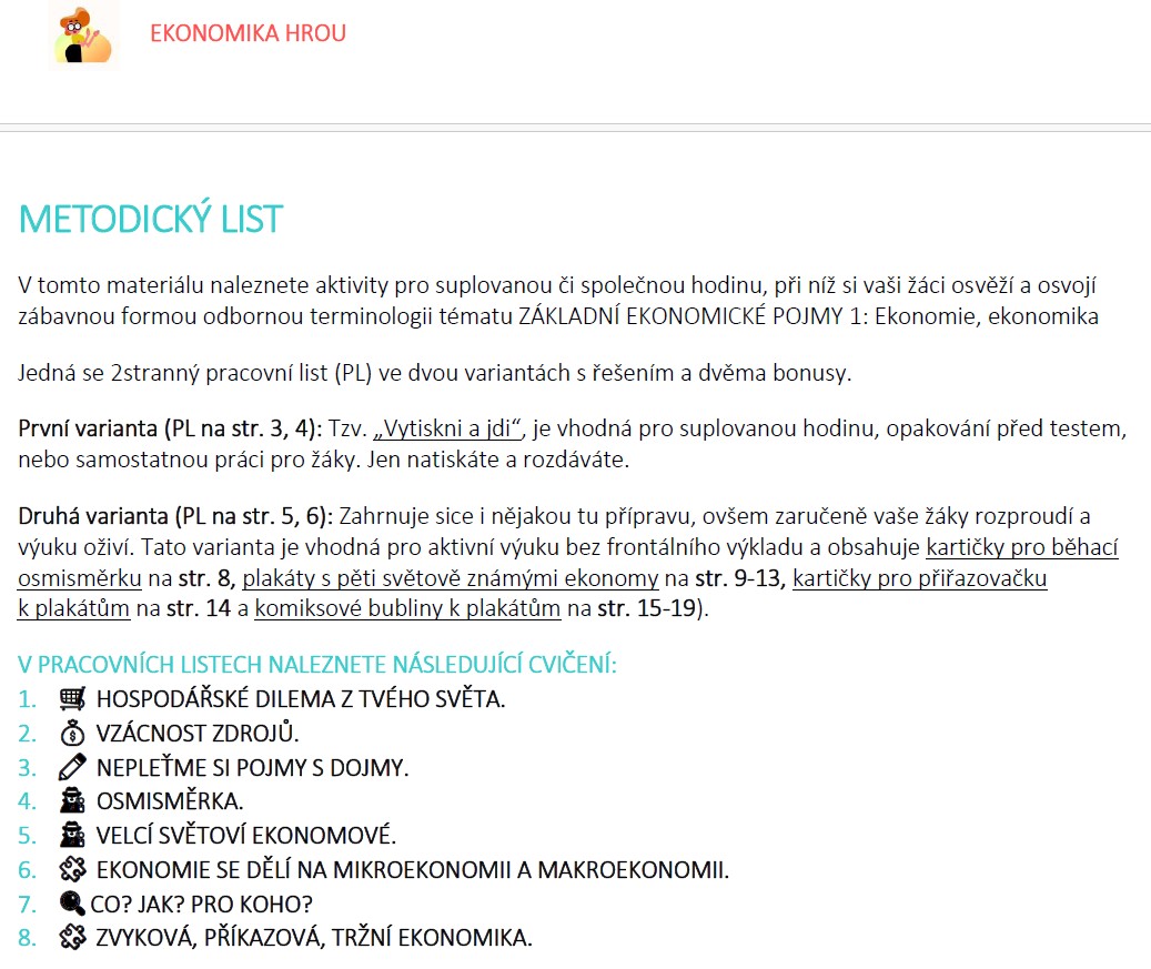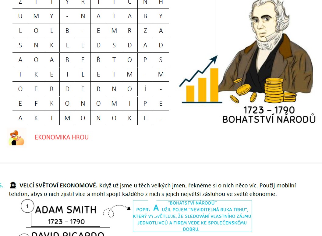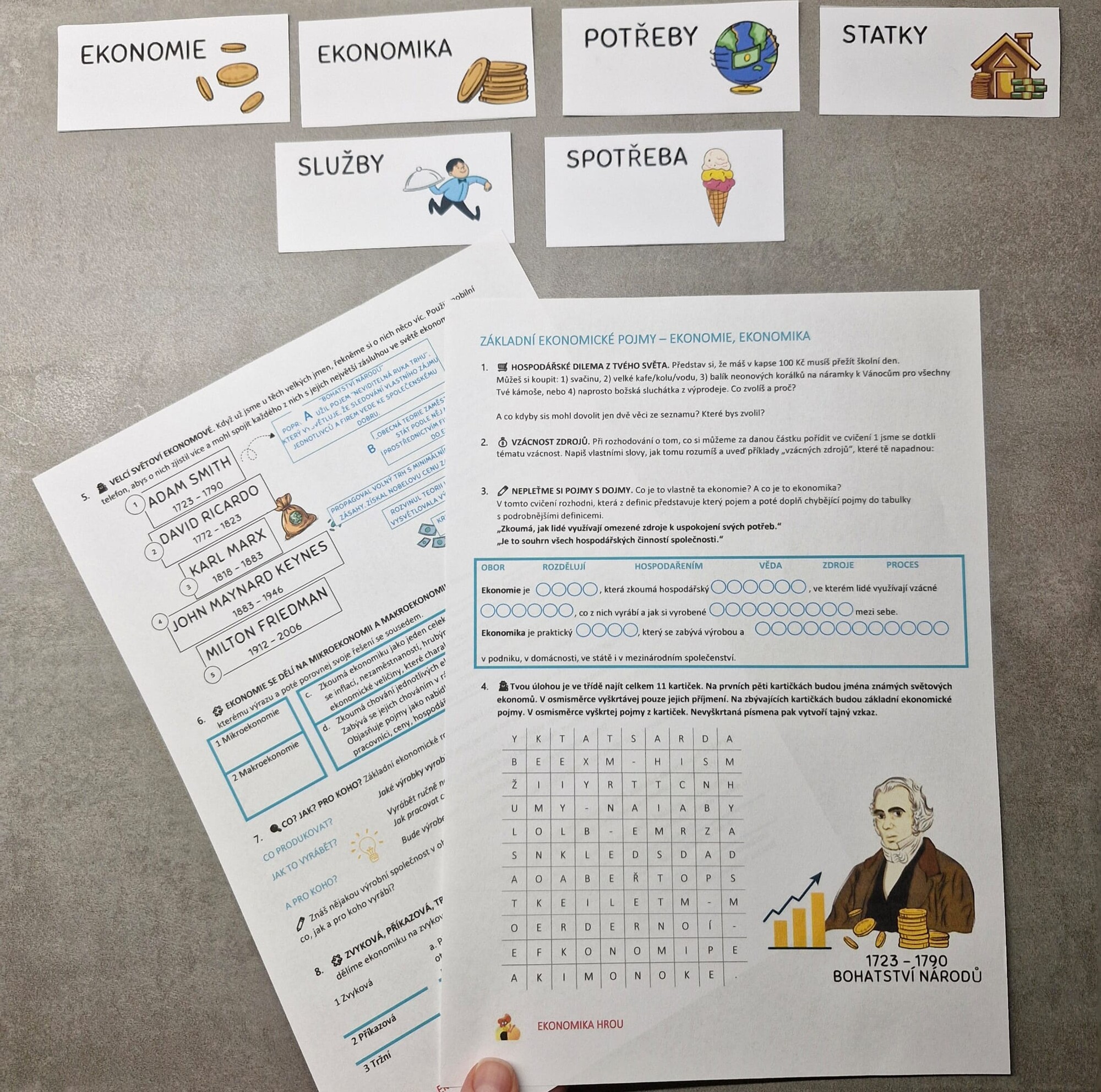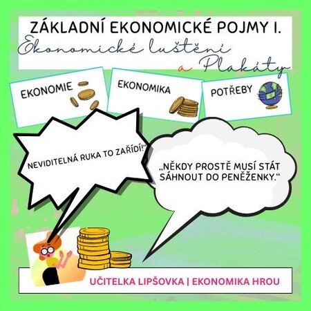 Druhá varianta: Zahrnuje sice i nějakou tu přípravu, ovšem zaručeně vaše žáky rozproudí a výuku oživí. Tato varianta je vhodná pro aktivní výuku bez frontálního výkladu a obsahuje kartičky pro běhací osmisměrku, plakátky s pěti světově známými ekonomy, kartičky pro přiřazovačku k plakátům a komiksové bubliny k plakátům.