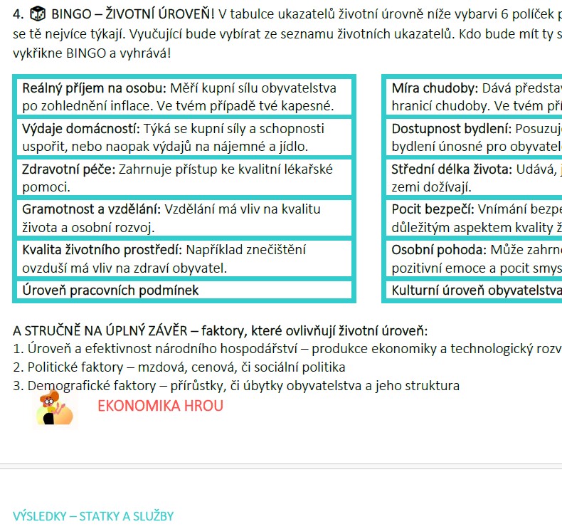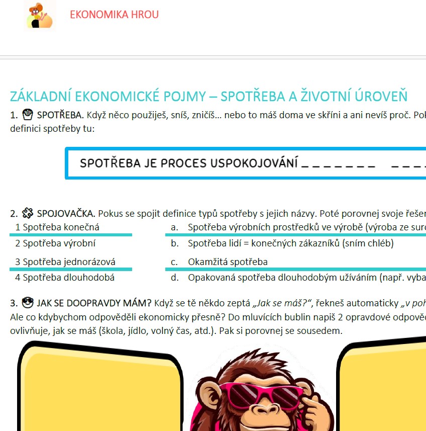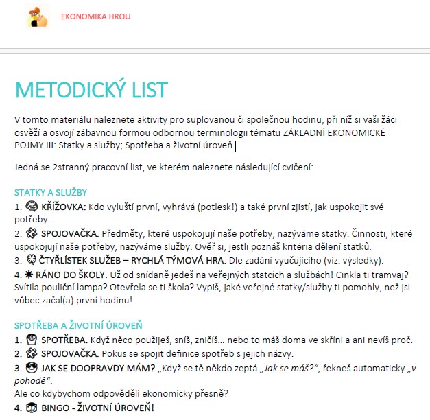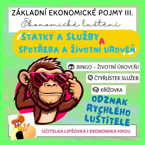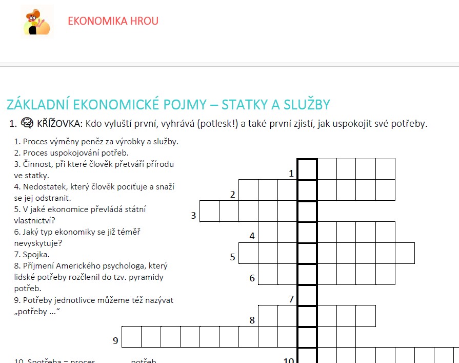 V tomto materiálu naleznete aktivity pro suplovanou či společnou hodinu, při níž si vaši žáci osvěží a osvojí zábavnou formou odbornou terminologii tématu ZÁKLADNÍ EKONOMICKÉ POJMY III: Statky a služby; Spotřeba a životní úroveň.