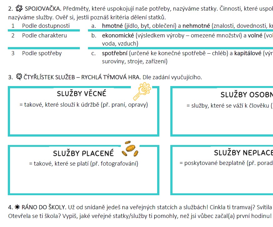 2. 🧩 SPOJOVAČKA. Předměty, které uspokojují naše potřeby, nazýváme statky. Činnosti, které uspokojují naše potřeby, nazýváme služby. Ověř si, jestli poznáš kritéria dělení statků.