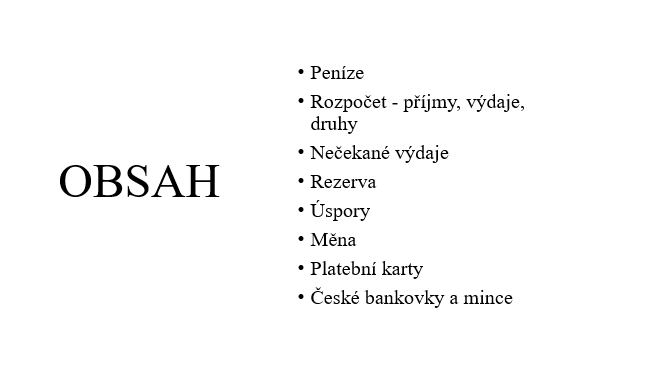 - peníze, platební karty, úrok, investice, daně, dluh, banka, půjčka, rozpočet, měna.
