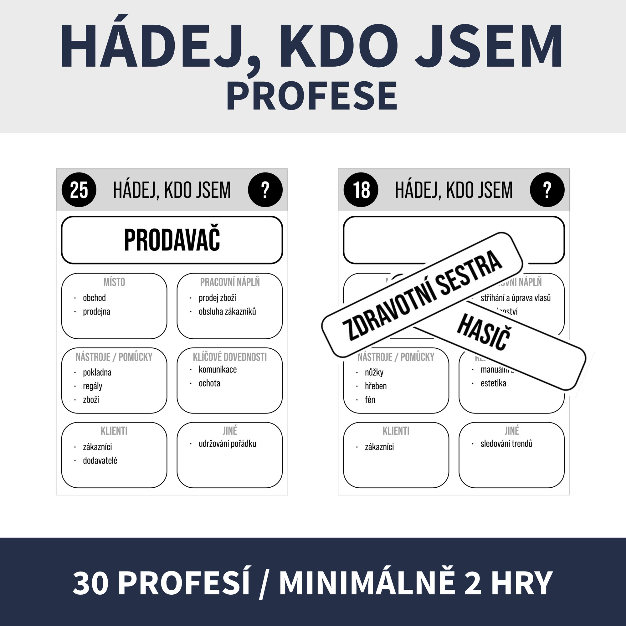 Sada: 30 profesí (přehledové kartičky s doplněným povoláním / kartičky s prázdným polem k doplnění povolání)