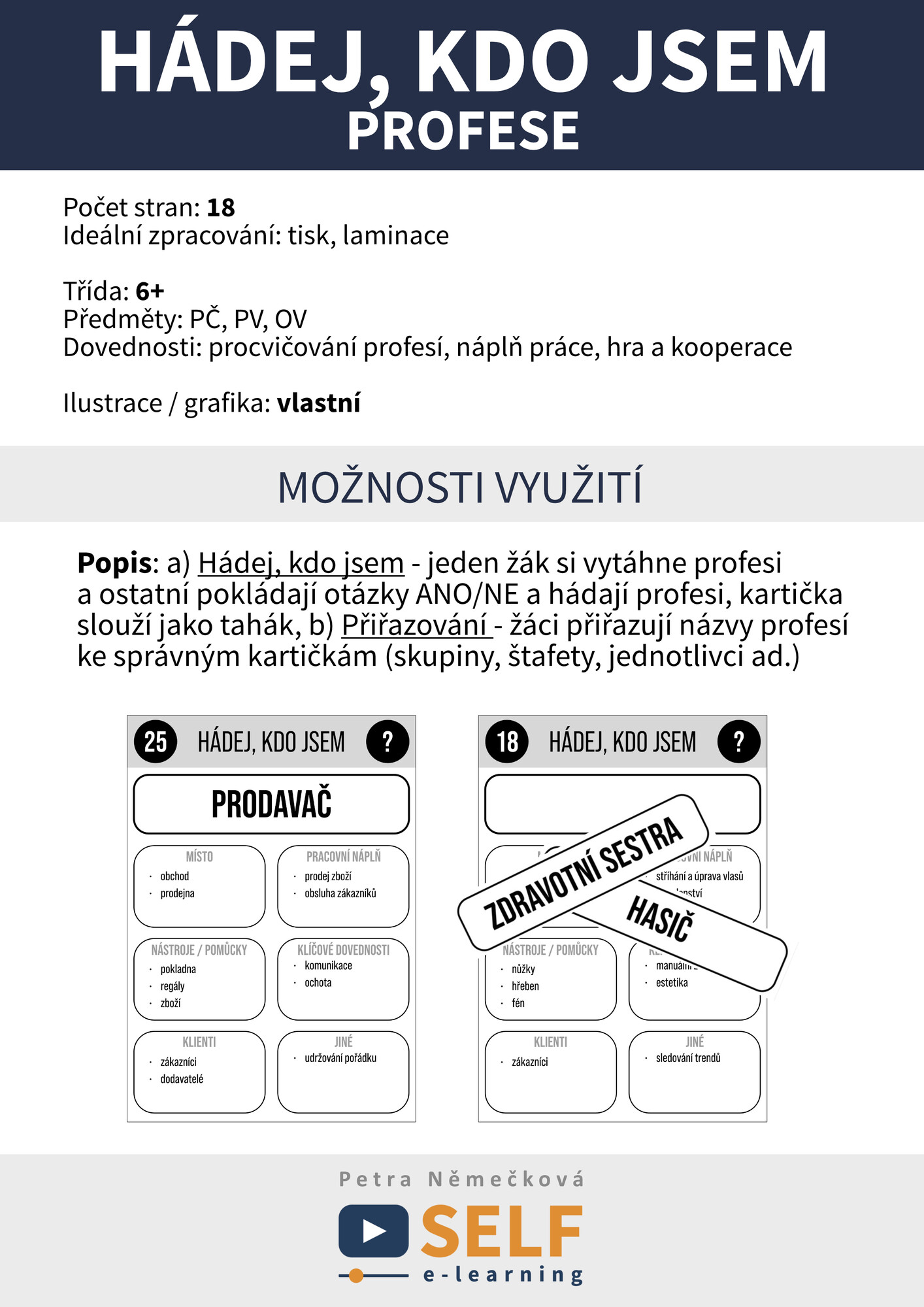 Popis: a) Hádej, kdo jsem - jeden žák si vytáhne profesi a ostatní pokládají otázky ANO/NE a hádají profesi, kartička slouží jako tahák, b) Přiřazování - žáci přiřazují názvy profesí ke správným kartičkám (skupiny, štafety, jednotlivci ad.)