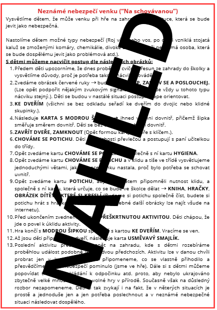 Výstupem tématu je tedy seznámení s možnostmi nenadálých situací a základní dětská orientace v nich. I když jsou v reálu případné nastálé situace psychicky náročné, jistá informovanost vede k lepší stabilitě dítěte, k minimalizaci chaosu, o což nám zde jde.