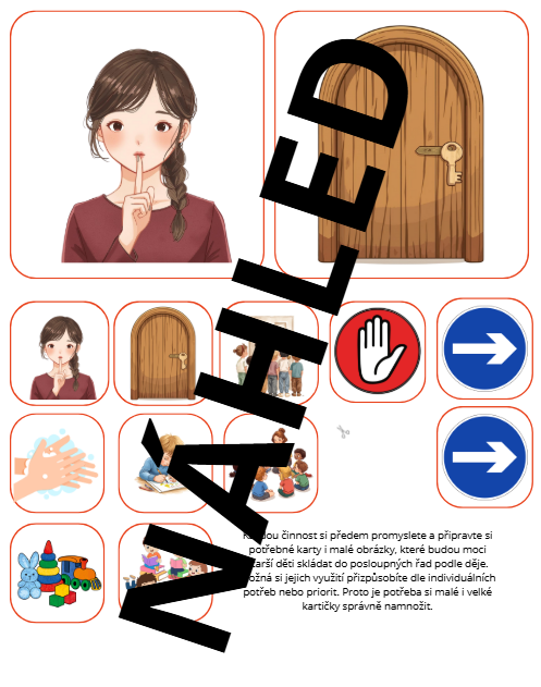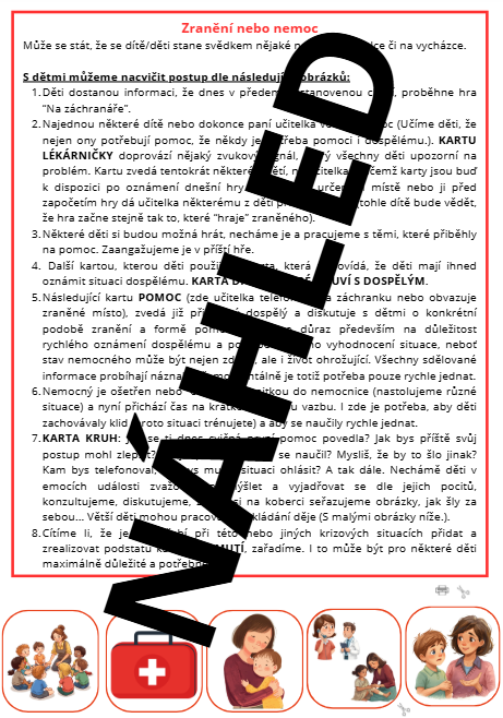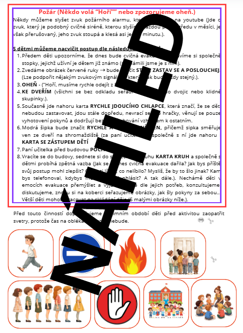 stáhněte si soubor, který může být dobrým pomocníkem pro vysvětlování a nácviky chování dětí předškolního věku (hodí se i pro děti z prvních či druhých ročníků ZŠ, stejně jako děti ze speciálního školství) při nenadálé krizové situaci. Soubor vám bude sloužit opakovaně, nejde o jednorázovou záležitost.
