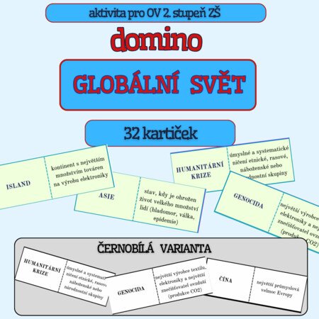 Tento materiál obsahuje hru typu DOMINO, ve které si žáci procvičí znalost pojmů v oblasti GLOBÁLNÍ SVĚT.