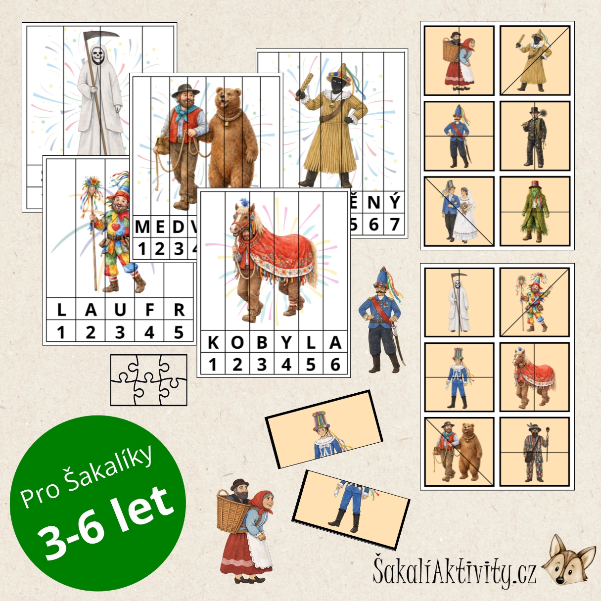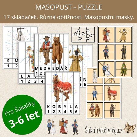 Puzzle Masopust od ŠakalíAktivity.cz jsou vzdělávací aktivitou vhodnou pro mateřské školy, 1. stupeň základních škol, školní družiny i domácí vzdělávání. Prostřednictvím skládání puzzlí se děti seznamují s masopustními maskami, zimní atmosférou a tradičními motivy tohoto období.