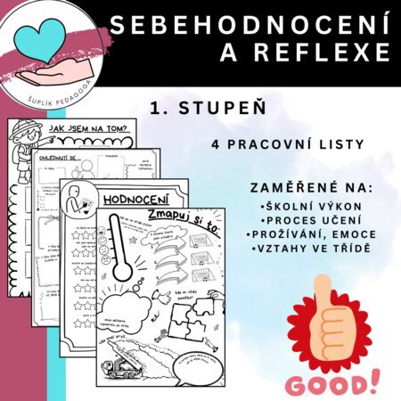Pracovní listy zaměřené na sebehodnocení a reflexi v oblastech: školní výkon, proces učení, prožívání, emoce a vztahy ve třídě pro žáky 1.stupně.