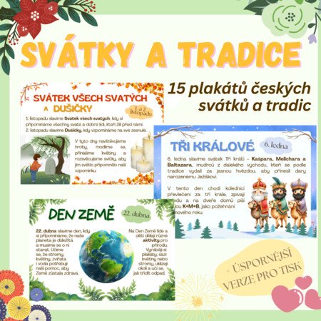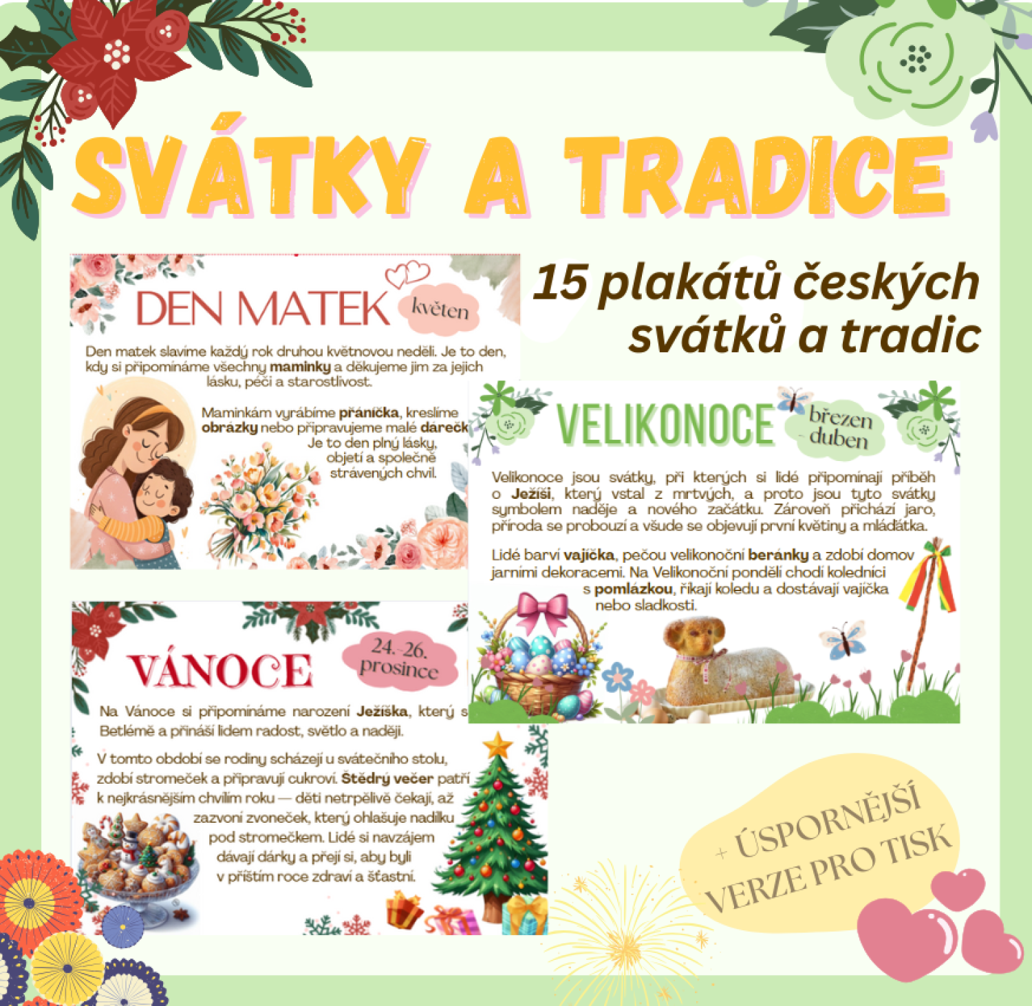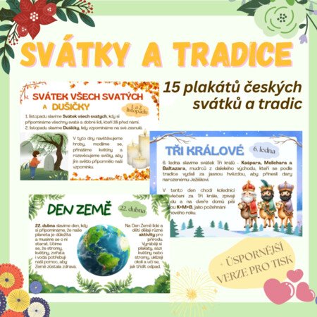 15 tematických plakátů pro děti, které představují nejvýznamnější svátky a tradice v průběhu roku. V popisu je, co svátek znamená a jak se slaví.