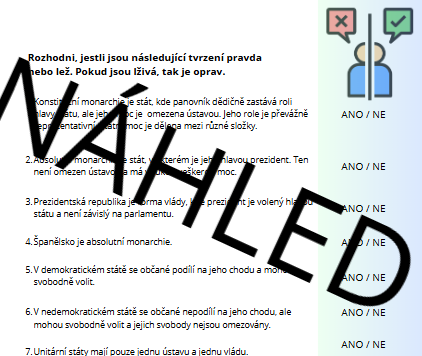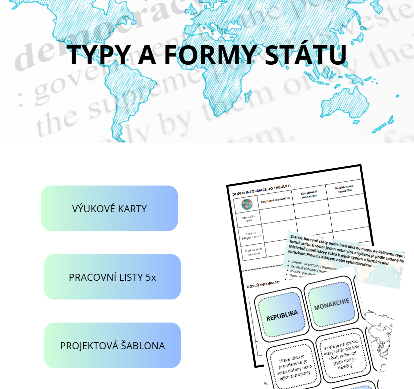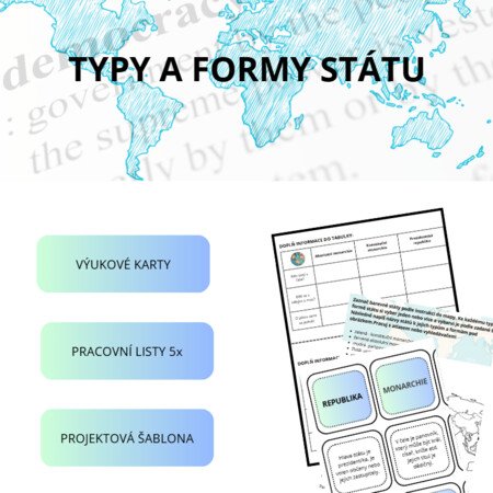 Materiál je vhodný na druhý stupeň ZŠ k seznámení se s tématem typy a formy státu a k jeho procvičení. Obsahuje několik aktivit, na kterých mohou žáci pracovat samostatně nebo ve skupinách. Je určený do hodin výchovy k občanství, ale může se použít i v hodinách zeměpisu, protože se zde objevují mezipředmětové vztahy se zeměpisem.