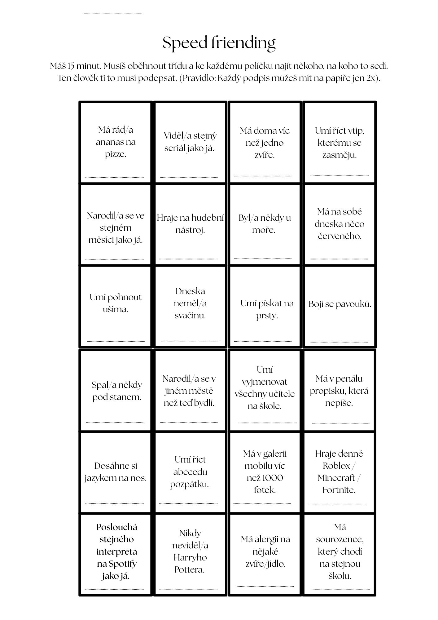 Méně průbojným dětem nabízí aktivita jasný scénář a konkrétní úkoly. Žák nemusí vymýšlet téma konverzace, má v ruce „návod“, což snižuje sociální úzkost a dodává odvahu k oslovení ostatních.