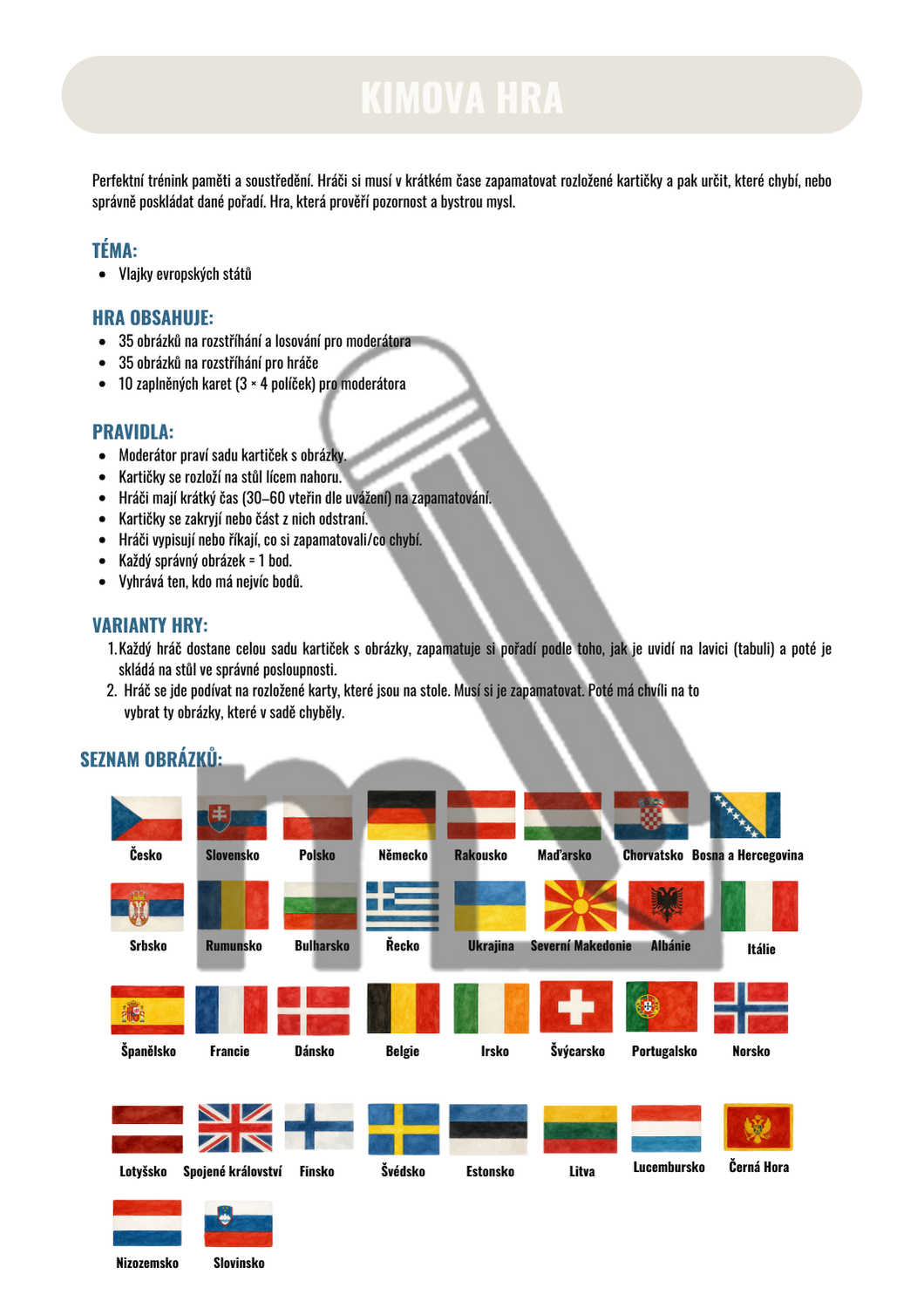 Perfektní trénink paměti a soustředění. Hráči si musí v krátkém čase zapamatovat rozložené kartičky a pak určit, které chybí, nebo správně poskládat dané pořadí. Hra, která prověří pozornost a bystrou mysl.