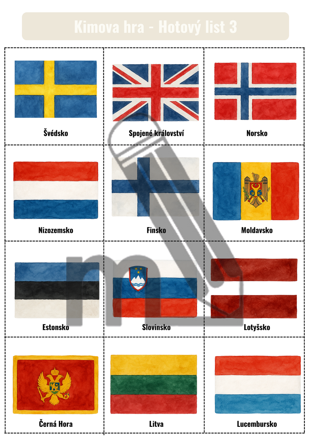 - 10 zaplněných karet (3 × 4 políček) pro moderátora
