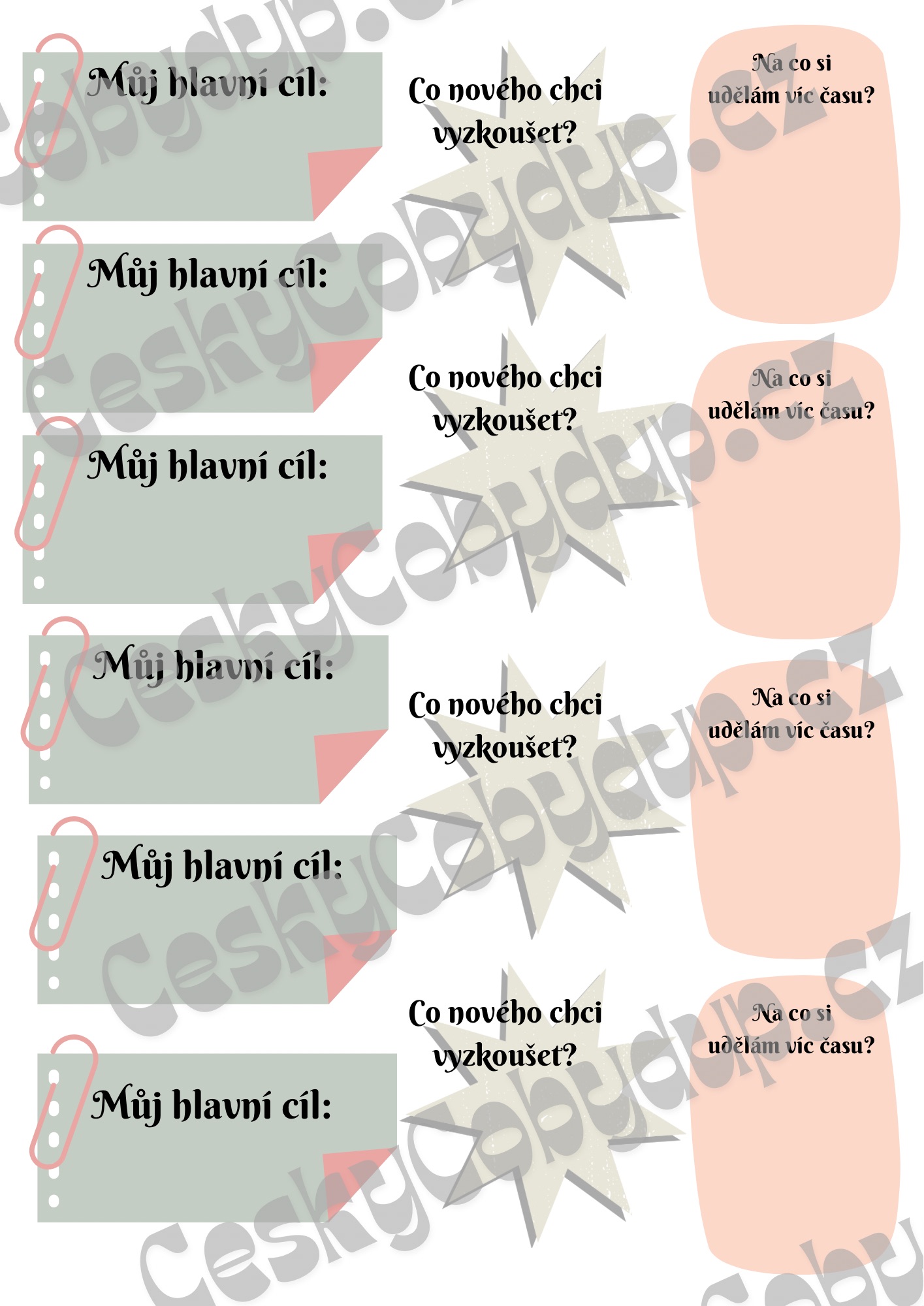 Na prvních třech stranách najdete štítky týkající se studijních cílů, rozvoje osobnosti z hlediska vědomostí a dovedností. Další strana obsahuje obecnější cíle (na co chci ušetřit, kam se chci podívat atd.), následující strana je více osobní - najdete zde dva štítky zaměřené na osobní vztahy a na poté dva listy s otázkami z pohledu zdraví.
