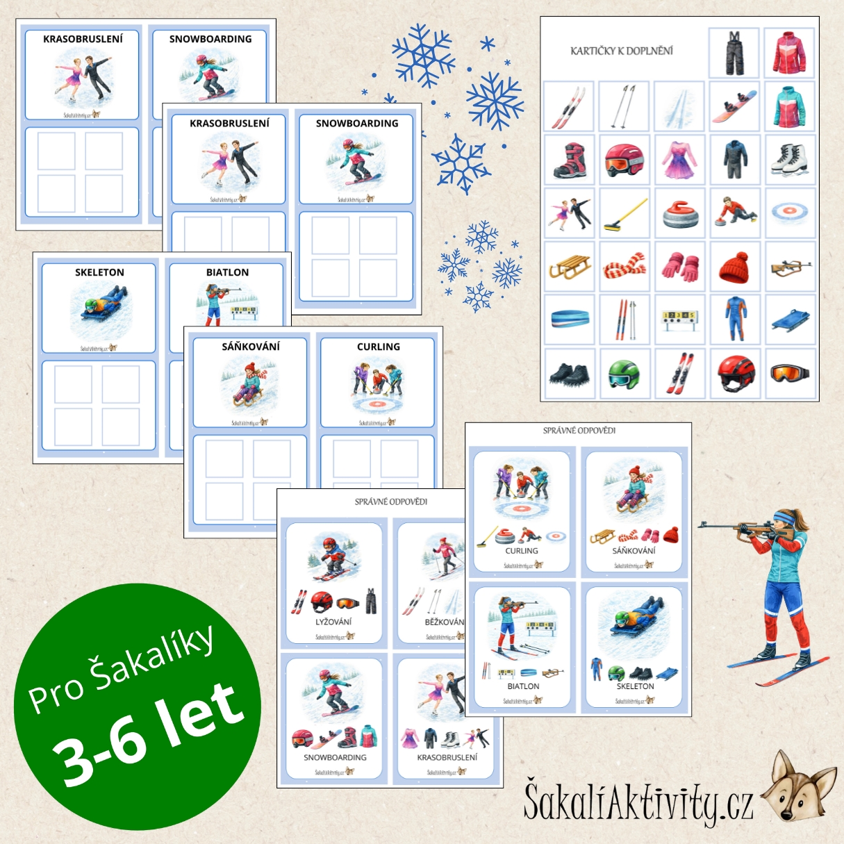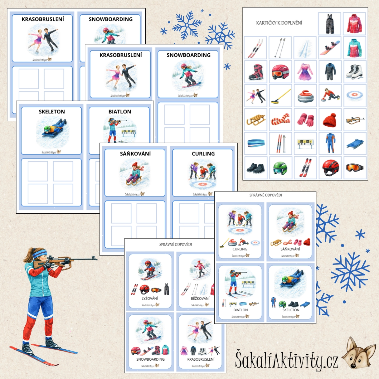 Výuková sada Zimní sporty a potřeby – přiřazování od ŠakalíAktivity.cz pomáhá dětem poznat zimní sporty a pochopit, jaké vybavení je pro jednotlivé disciplíny nezbytné. Aktivita je vhodná pro mateřské školy, 1. stupeň základních škol i domácí vzdělávání.