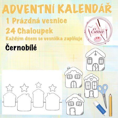 1× šablona A4 s obrysy 4 chaloupek a hvězdičkou nad každou chaloupkou.