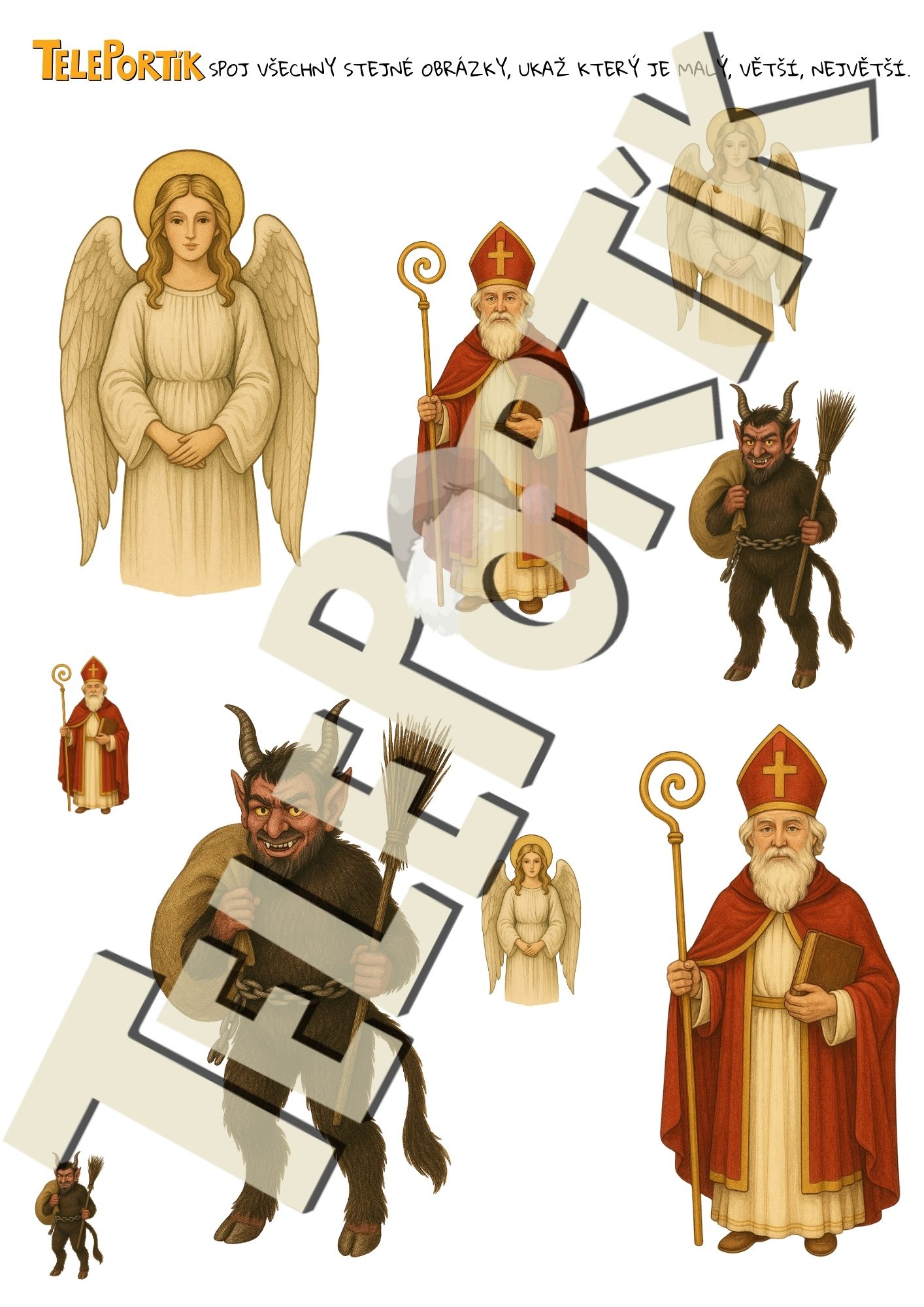 Materiál Anděl, Čert a Mikuláš je tematicky zaměřen na období začátku prosince, kdy se děti seznamují s tradičními postavami mikulášské nadílky. Prostřednictvím různorodých her a aktivit rozvíjí zrakové vnímání, logické myšlení, předmatematické představy, slovní zásobu i jemnou motoriku. Materiál je určen pro děti předškolního věku a lze jej využít jak v rámci tematických celků, tak při samostatné aktivitě.
