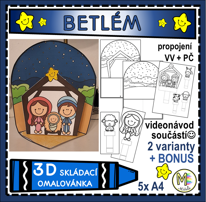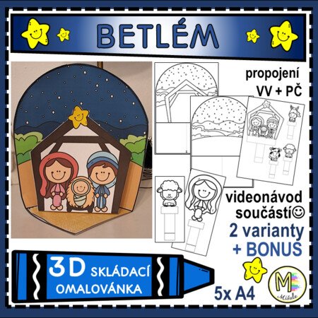 Tento originální výukový materiál propojuje výtvarnou výchovu (VV) a pracovní činnosti (PČ) a zároveň přináší dětem radost z tvoření v období adventu i Tří králů. Materiál umožňuje vytvořit krásný 3D betlém, který může sloužit jako výzdoba třídy, dekorace na vánoční besídku nebo jako součást projektového dne.