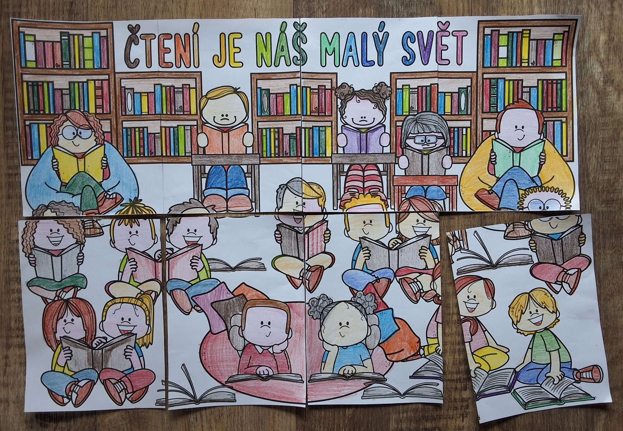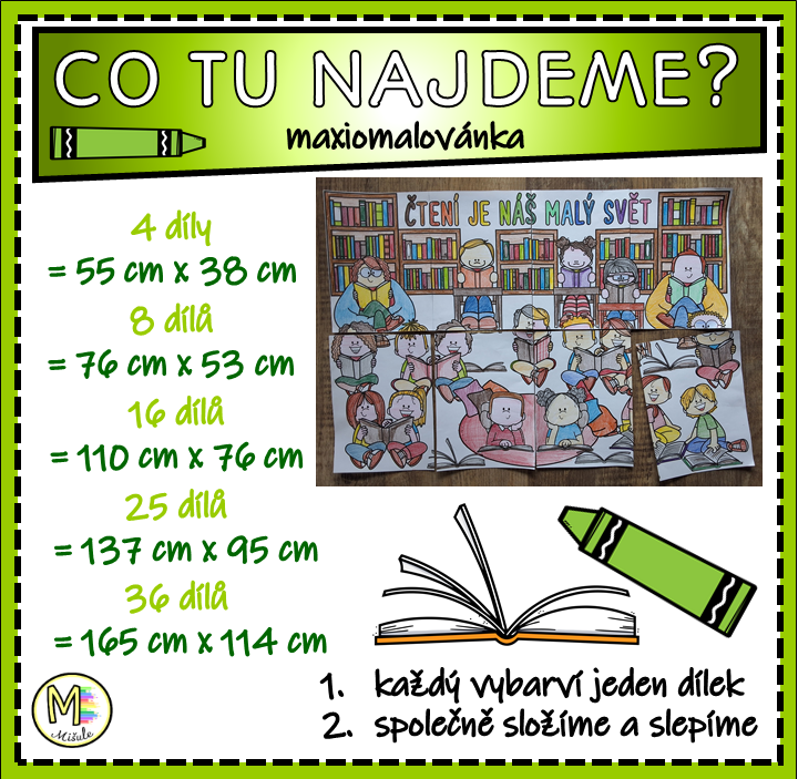 Materiál obsahuje velkoformátový společný obraz s motivem dětí v knihovně a tematickým nápisem „Čtení je náš malý svět“. Obrázek je rozdělen do několika variant podle počtu žáků (4, 8, 16, 25 nebo 36 částí). Každý žák vybarvuje jeden dílek, který je následně spojen do jednoho velkého obrazu. Výsledkem je působivá nástěnná práce, která symbolizuje, že každý člen kolektivu je důležitý.
