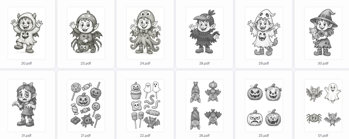 Připraveni na Halloween? 🎃 Vytvořte si vlastní veselou halloweenskou třídu hrůzy – barevnou nebo černobíle strašidelnou! Soubor obsahuje 31 stran A4 v černobílém provedení. Obrázky jsou připraveny k vybarvení pastelkami nebo barvami.