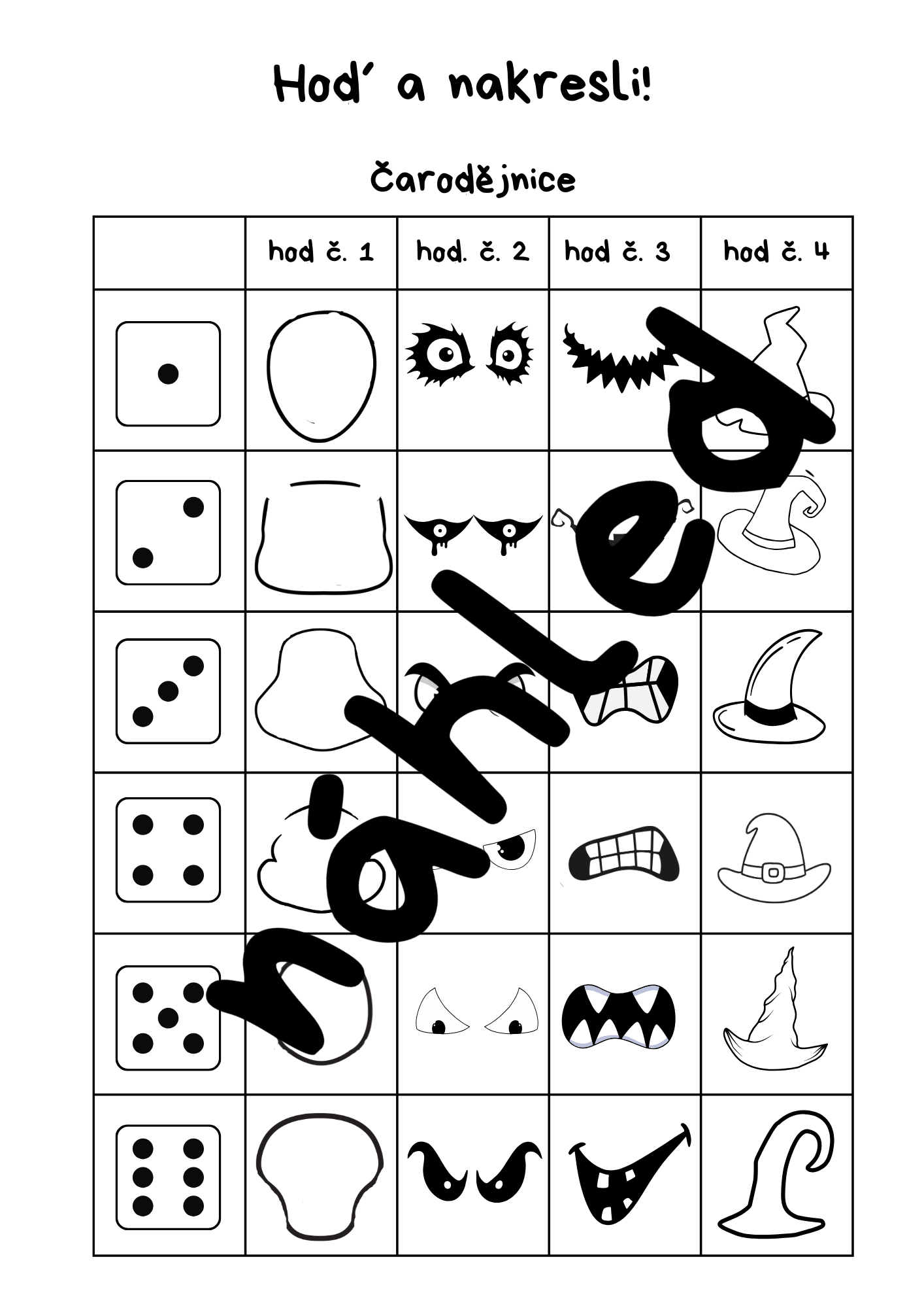 Vytiskněte si pracovní list, připravte čistý bílý papír a hrací kostku. Děti se pustí do hry. Hodí kostkou a podle předlohy vždy dokreslí jednu část postavičky. Kolik hodů, tolik částí! Celkově se hází čtyřikrát. Na konci se objeví celý obrázek, který si děti mohou dokreslit a vybarvit dle své fantazie. Aktivita je vhodná pro mateřské školy, 1. stupeň ZŠ, družiny i domácí tvoření.