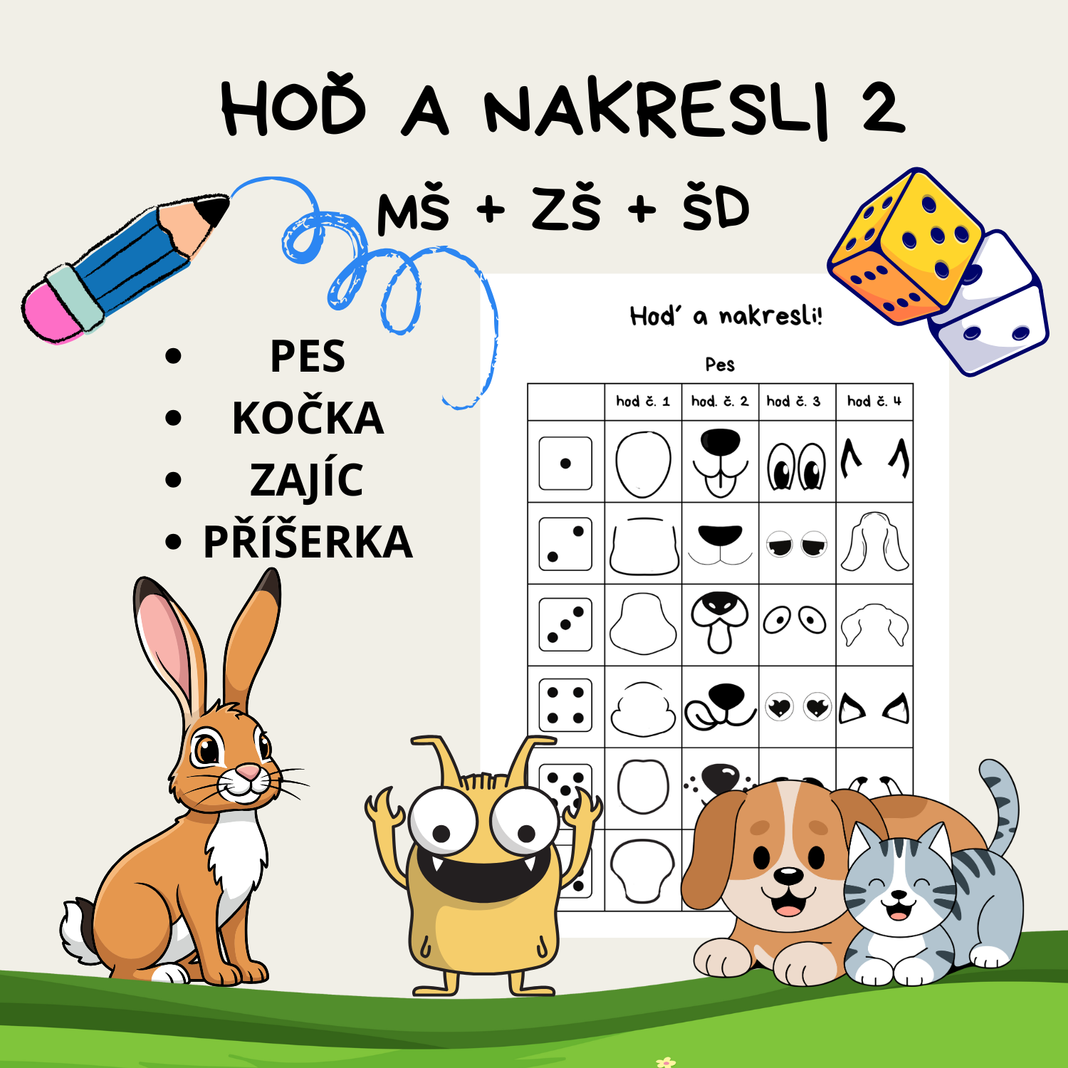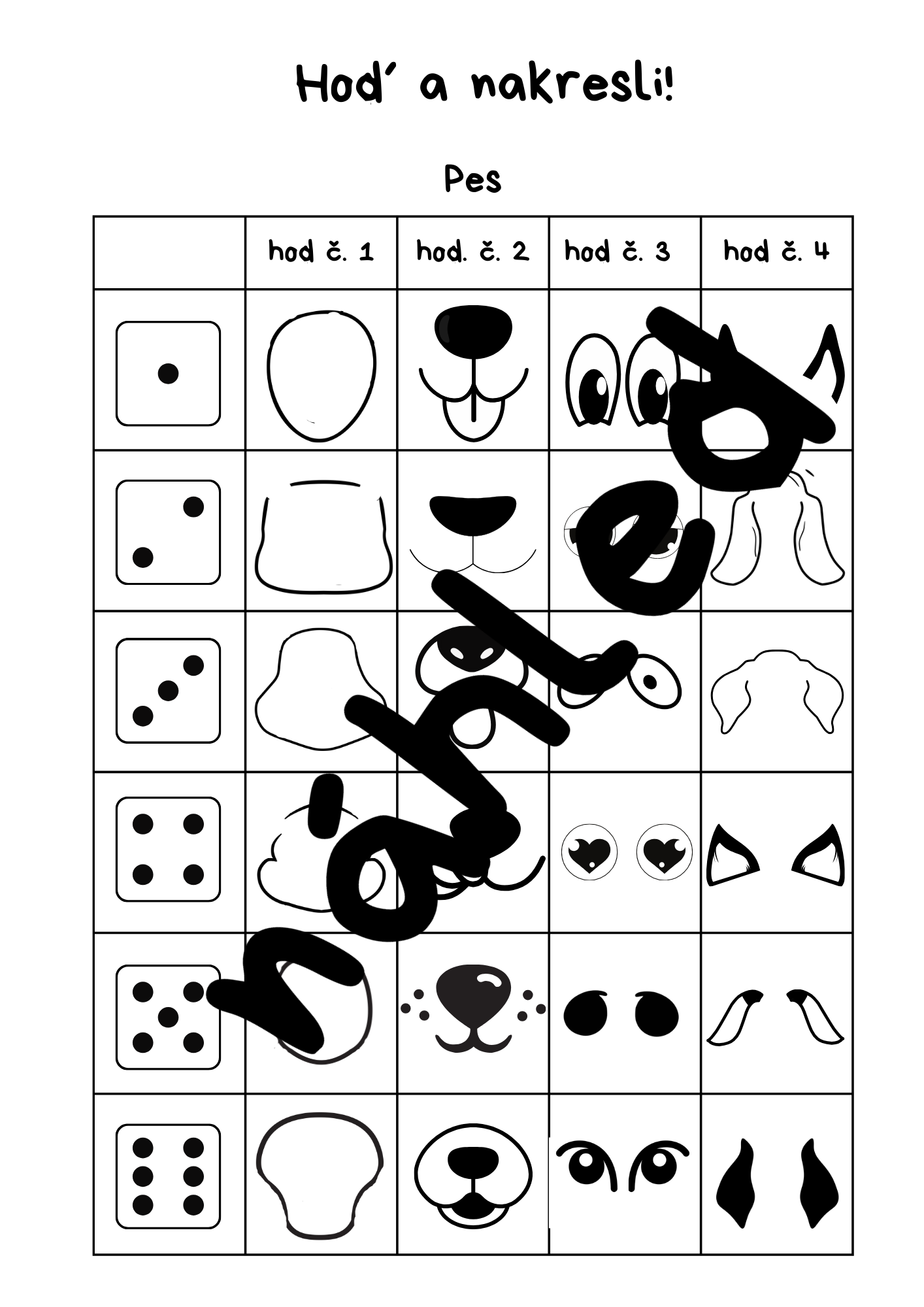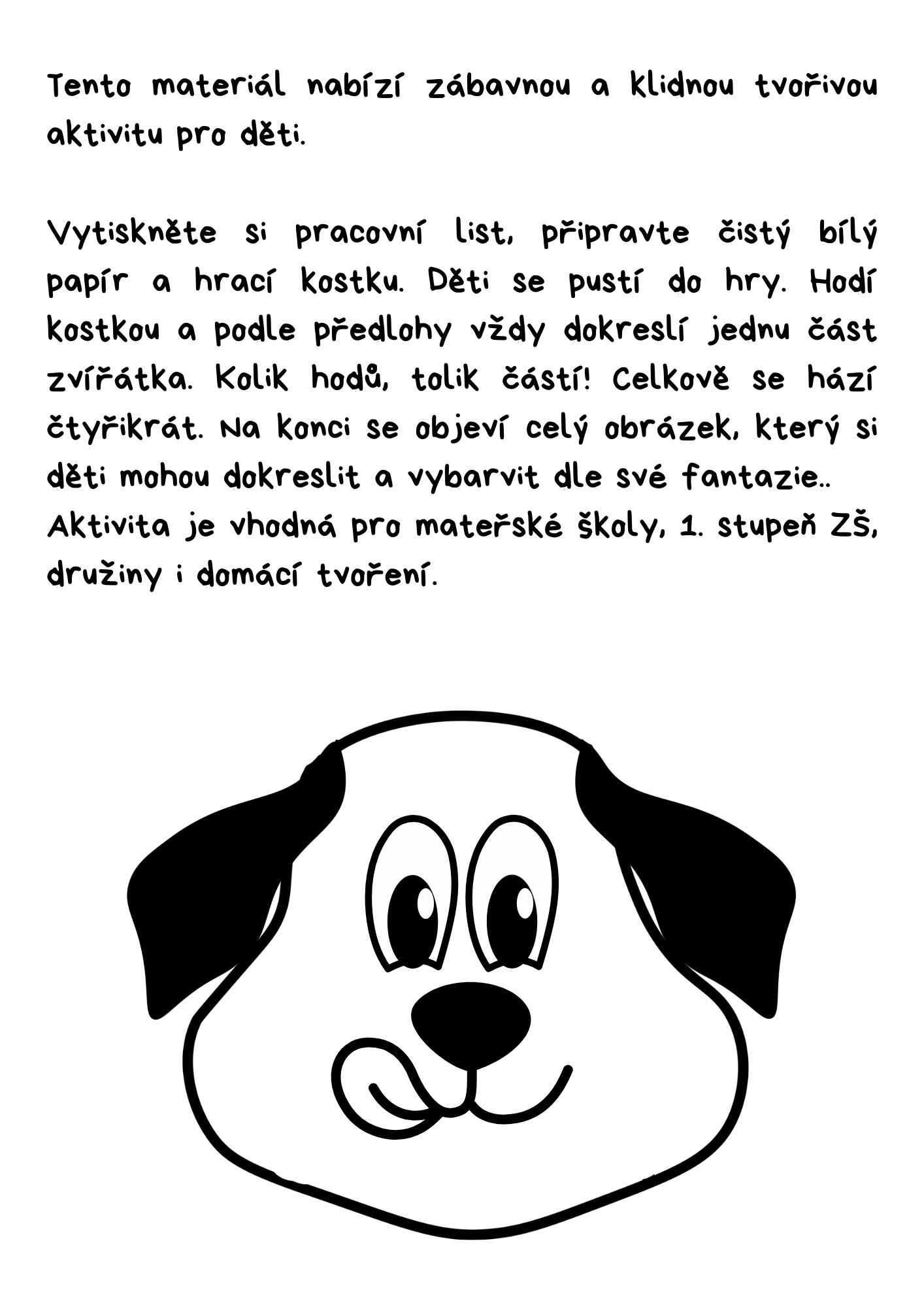 Vytiskněte si pracovní list, připravte čistý bílý papír a hrací kostku. Děti se pustí do hry. Hodí kostkou a podle předlohy vždy dokreslí jednu část zvířátka. Kolik hodů, tolik částí! Celkově se hází čtyřikrát. Na konci se objeví celý obrázek, který si děti mohou dokreslit a vybarvit dle své fantazie. Aktivita je vhodná pro mateřské školy, 1. stupeň ZŠ, družiny i domácí tvoření.