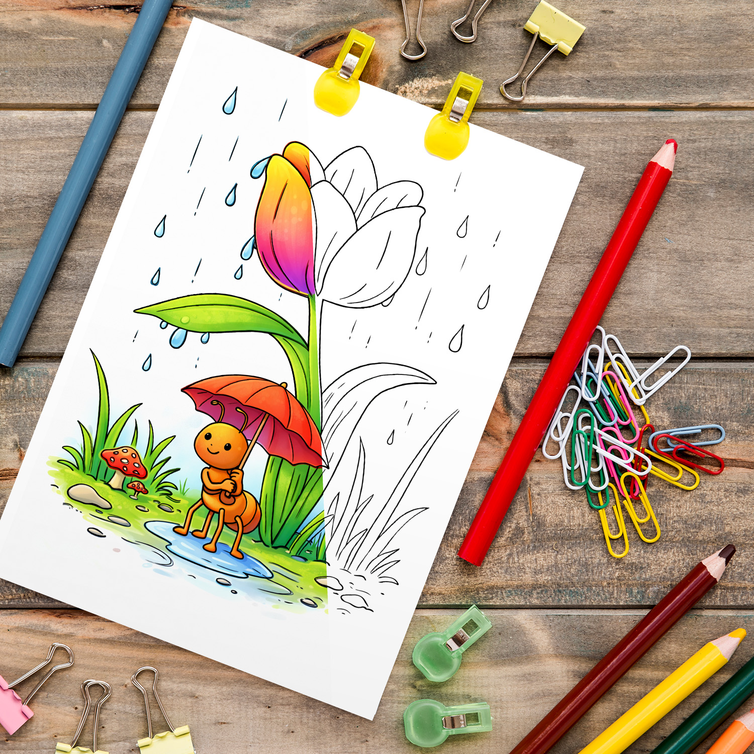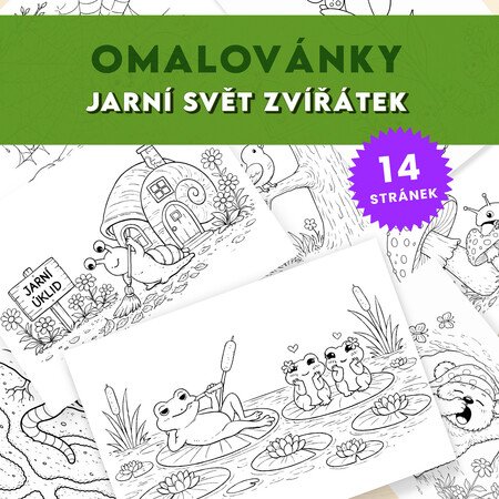 Omalovánky zachycují milé jarní motivy – například berušku a motýla, ptáčky u budky, ježka, medvěda, šneka při jarním úklidu, žabky u jezírka, včelku, pavoučka, mravence a další.