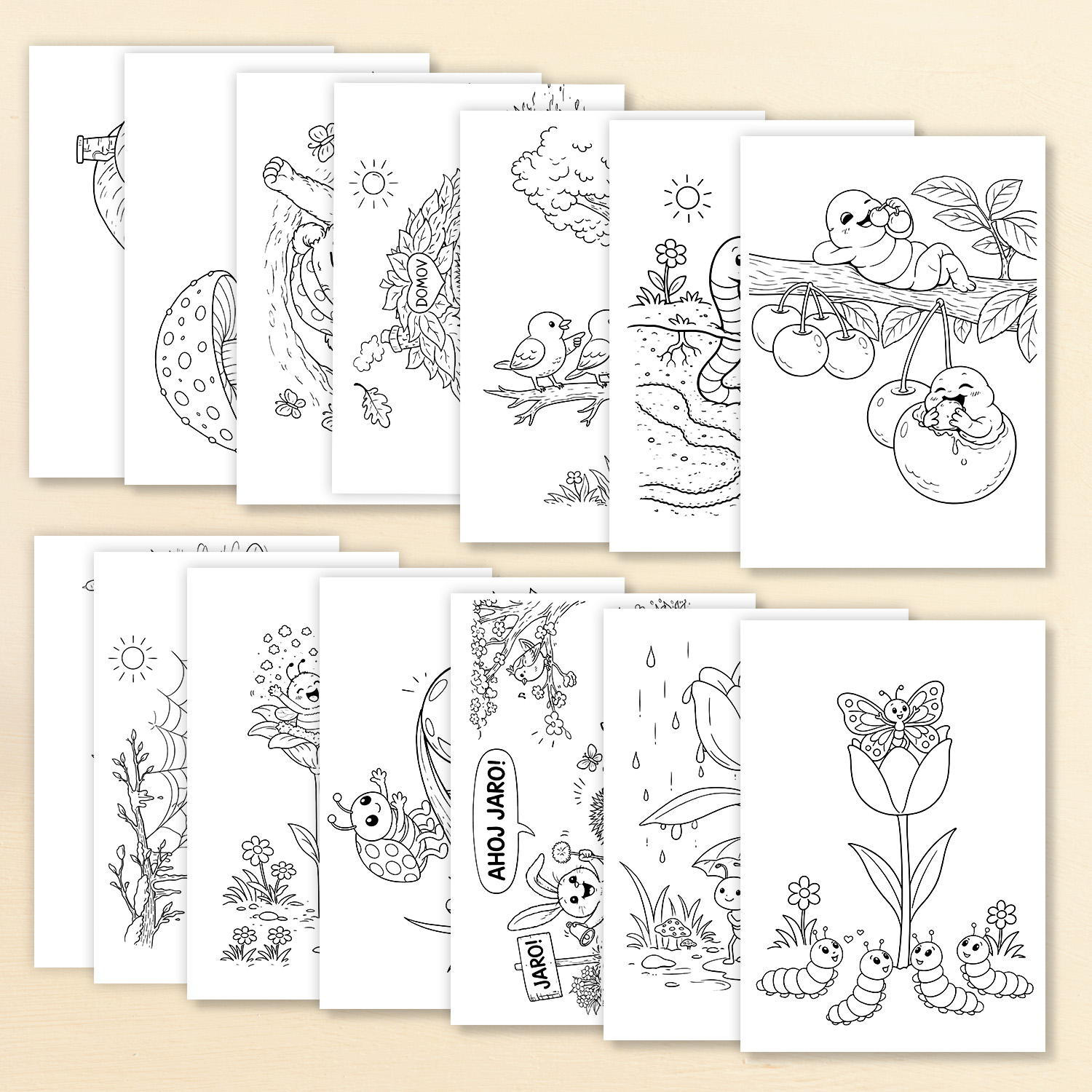Sada 14 jarních omalovánek se zvířátky a drobnými tvory.
