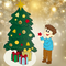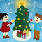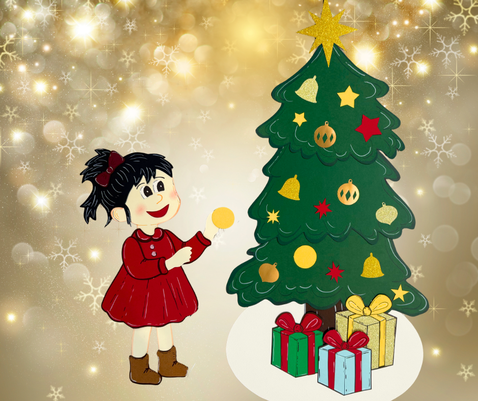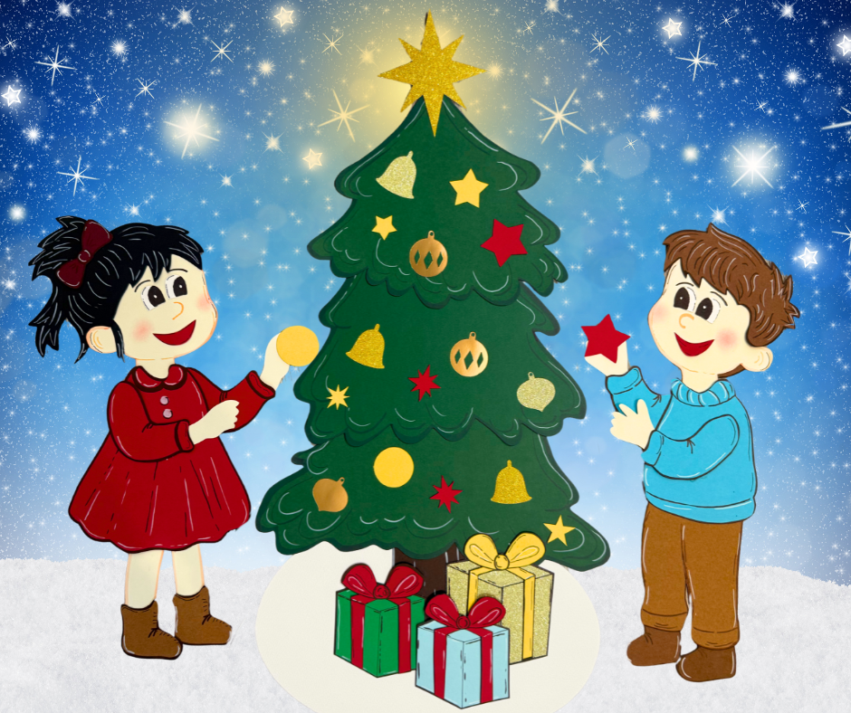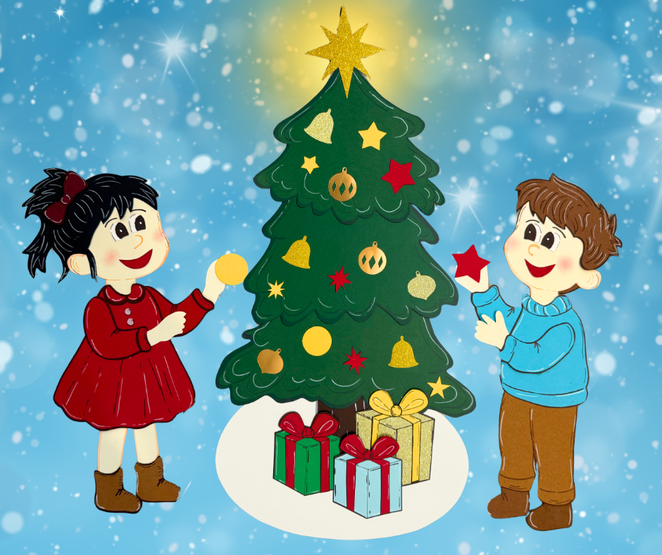 Holčička s chlapečkem zdobí stromeček, kolem nich se třpytí dárky a nad vším žáří nápis KOUZLO VÁNOC ✨