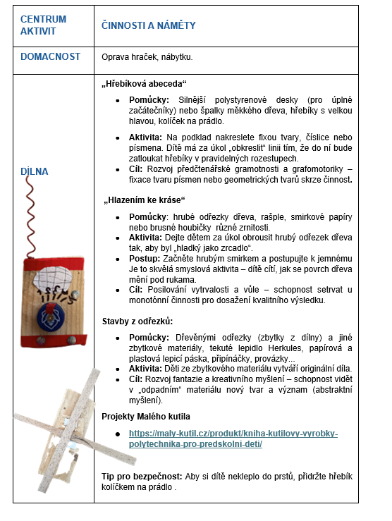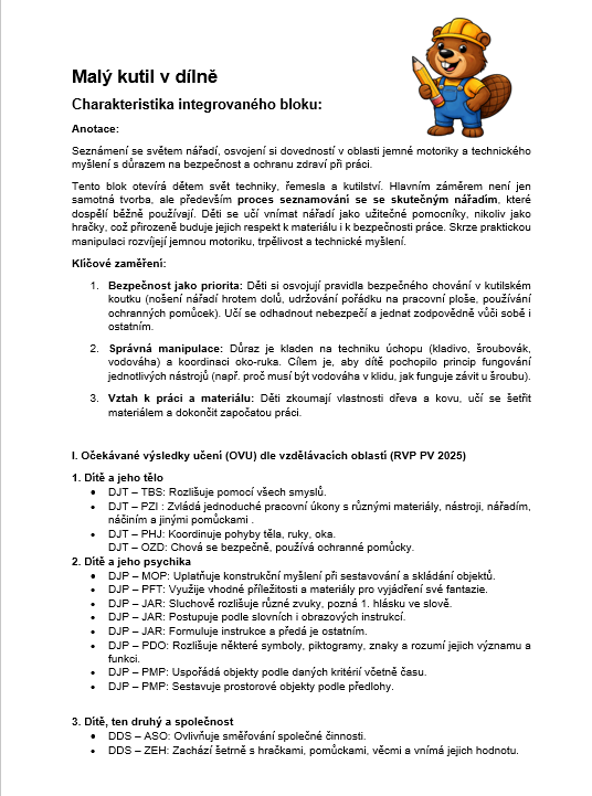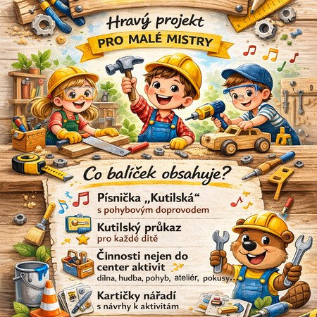 Tento projekt otevírá dětem svět techniky, řemesla a kutilství. Hlavním záměrem není jen samotná tvorba, ale především proces seznamování se se skutečným nářadím, které dospělí běžně používají. Děti se učí vnímat nářadí jako užitečné pomocníky, nikoliv jako hračky, což přirozeně buduje jejich respekt k materiálu i k bezpečnosti práce. Skrze praktickou manipulaci rozvíjejí jemnou motoriku, trpělivost a technické myšlení. Aktivity jsou navrženy tak, aby je děti zvládly samostatně bez zásahu dospělého.