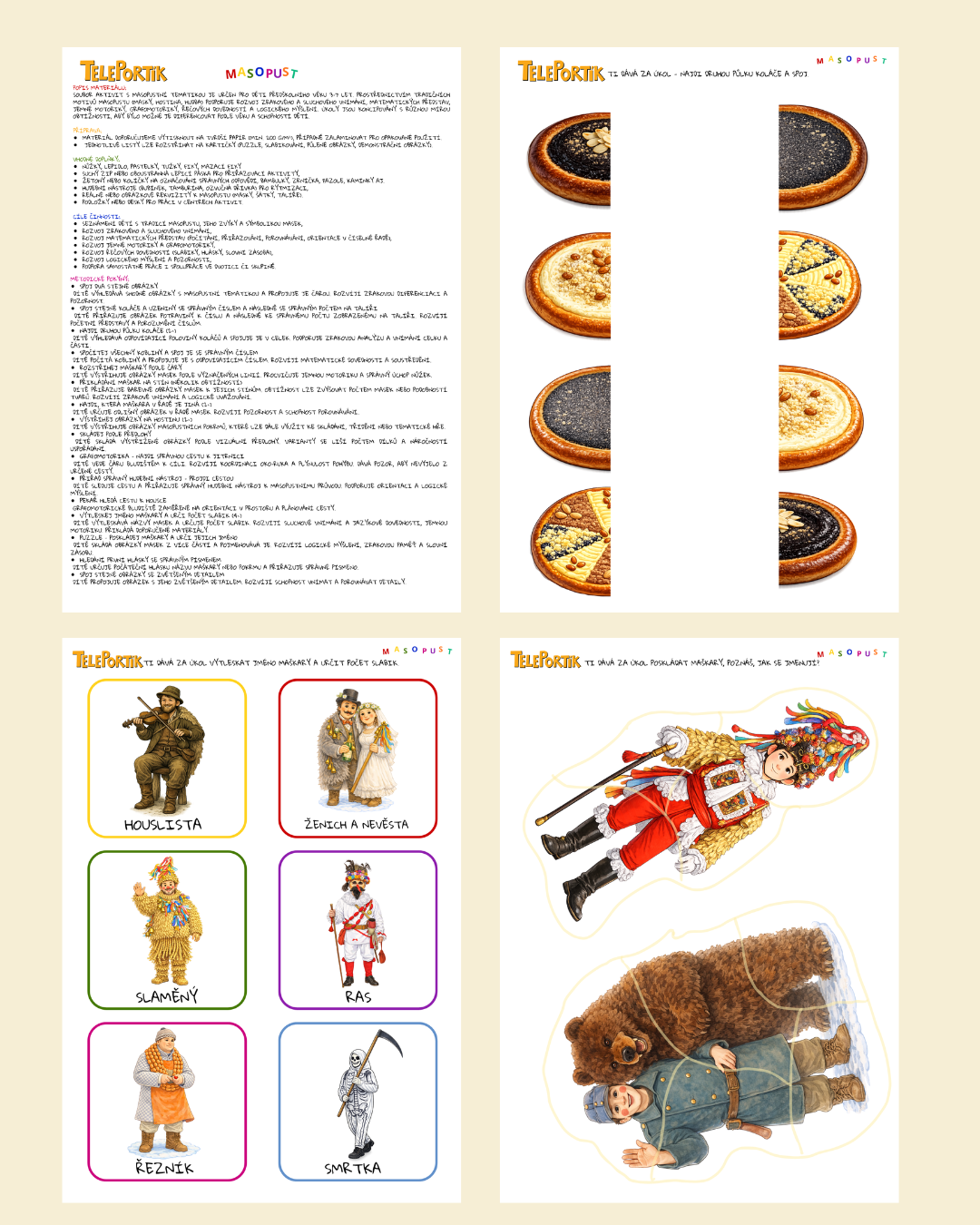 Materiál vychází z tradičního pojetí masopustu – děti se seznámí s tím, proč se masopust slaví, jaké masky se objevují v průvodech, jaký mají význam a jaké činnosti k tomuto období patří (hudba, tanec, hostina, pečení, zabijačka). Vše je zpracováno citlivě s ohledem na věk dětí a možnosti využití v mateřské škole i doma.