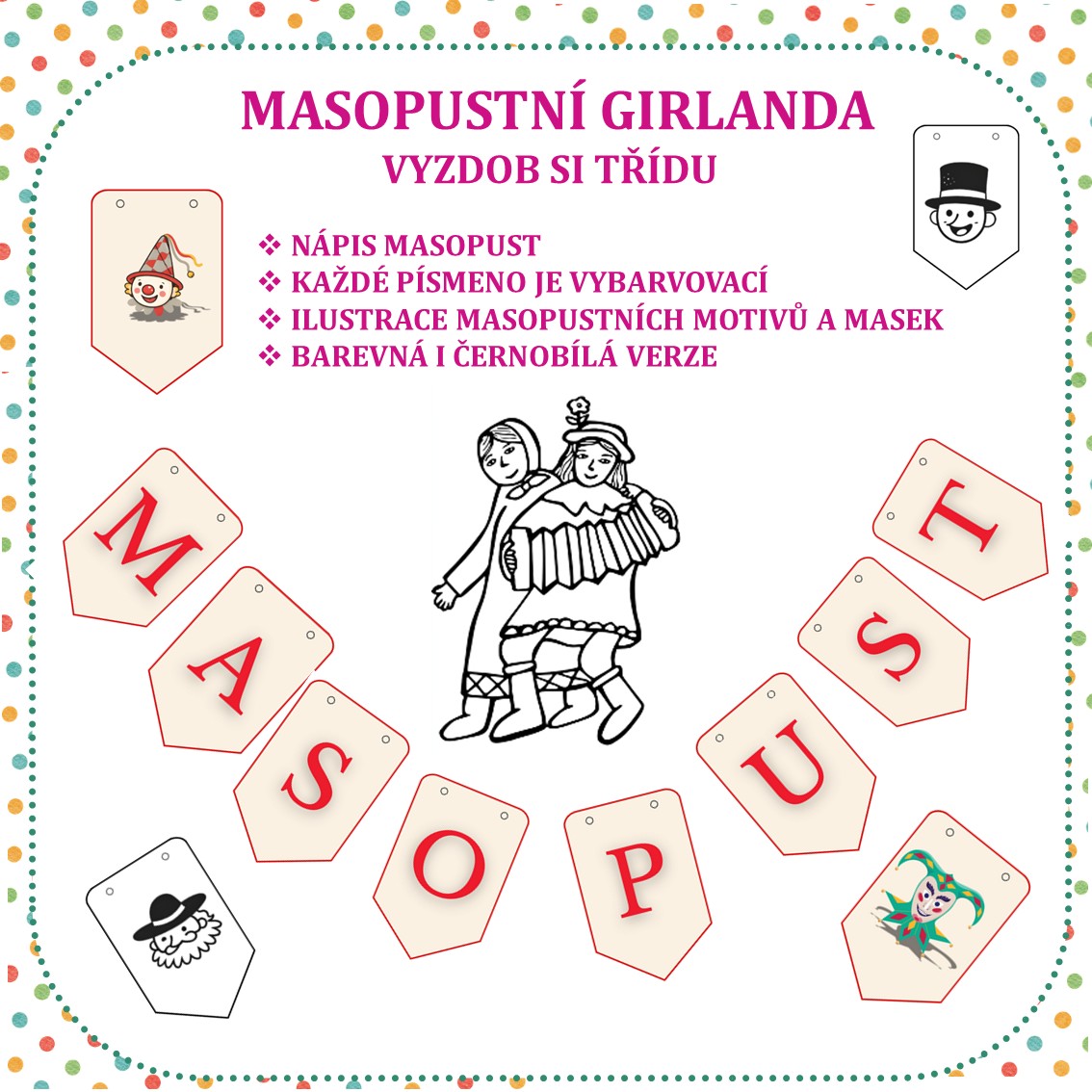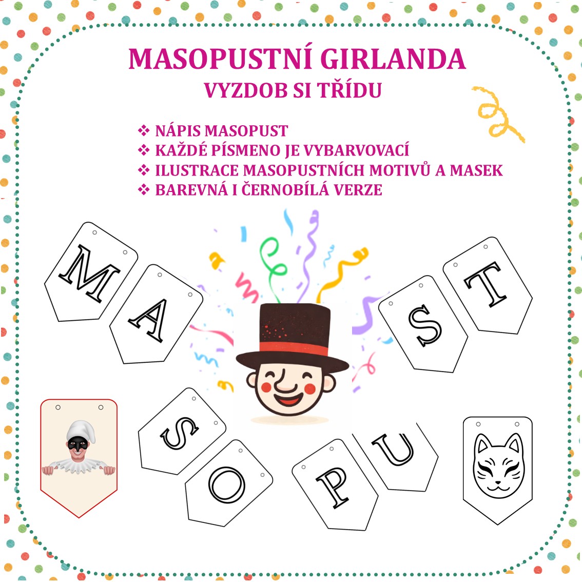 Součástí girlandy jsou i písmena tvořící po složení nápis MASOPUST – každé písmeno samostatně, (1x barevně a 1x k vybarvení) určené k zavěšení jako girlanda