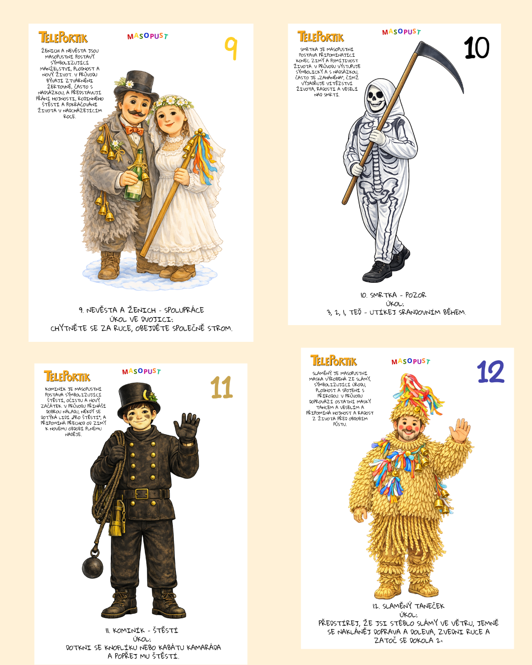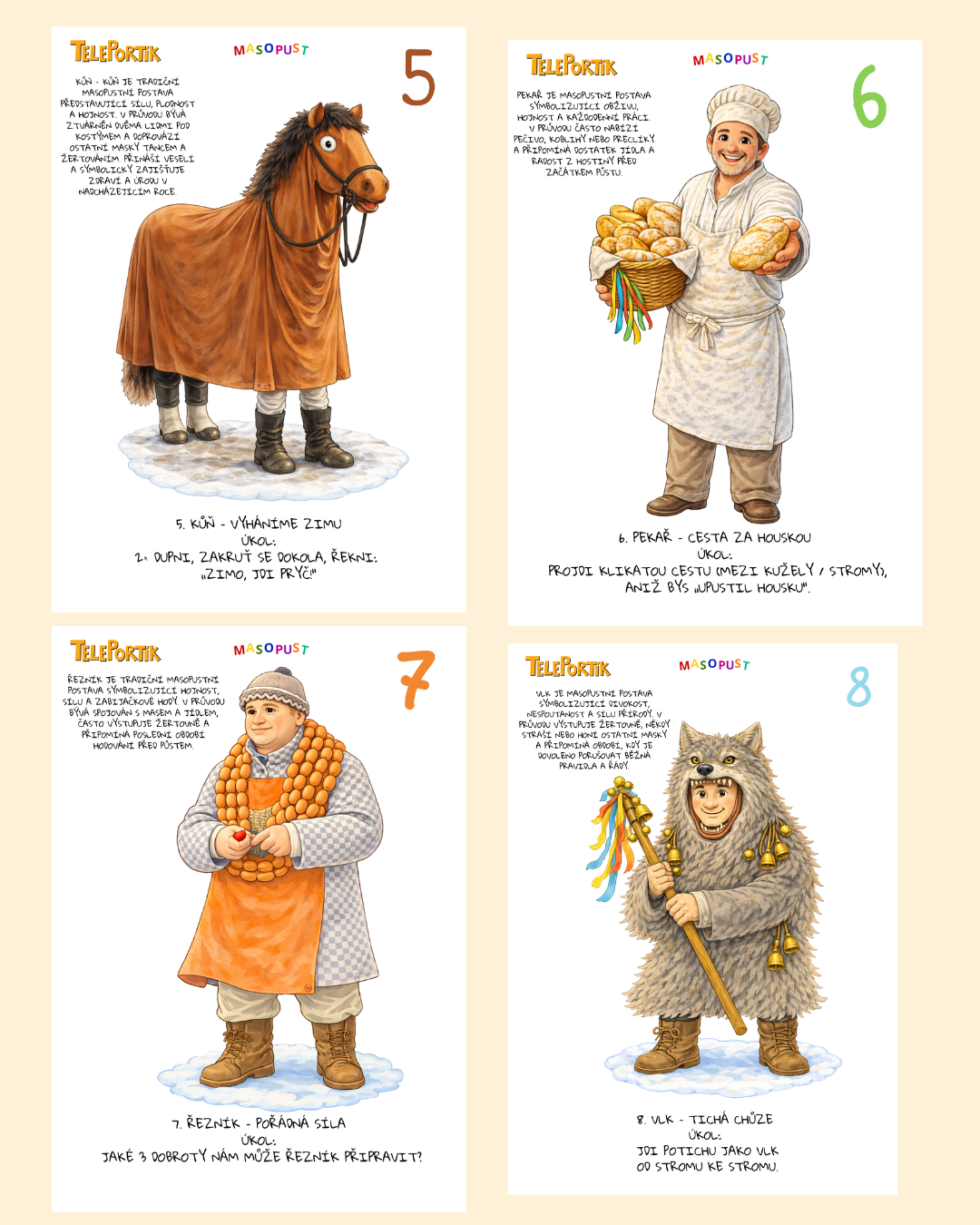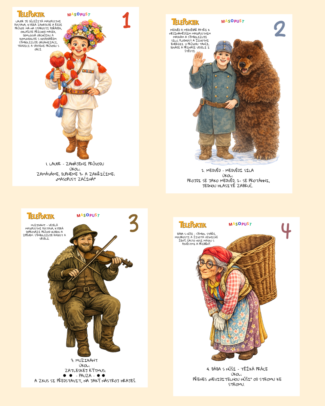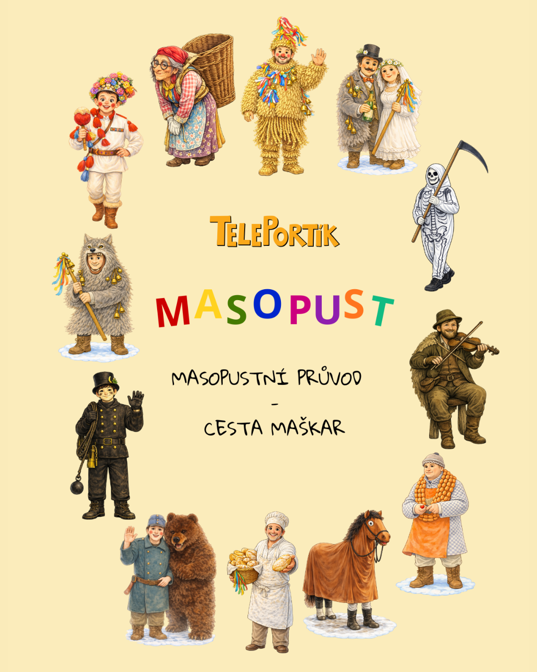 Prožijte s dětmi ve věku 3–7 let radost z masopustu! Na venkovní stezce děti potkají tradiční maškary – medvěda, koně, Slaměného, bábu s nůší, nevěstu a ženicha, kominíka či řezníka – a u každé plní jednoduchý úkol rozvíjející pohyb, motoriku, řeč a pozorování.