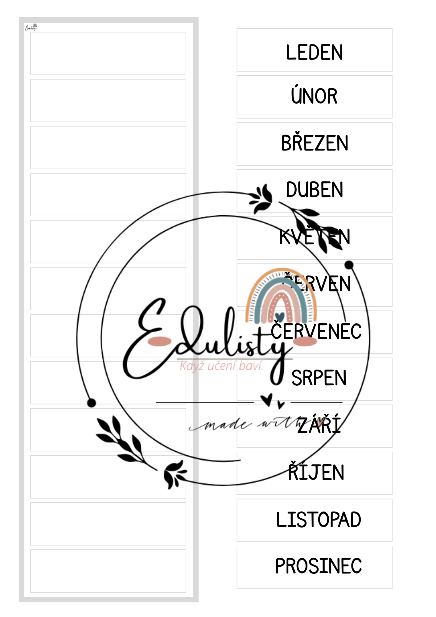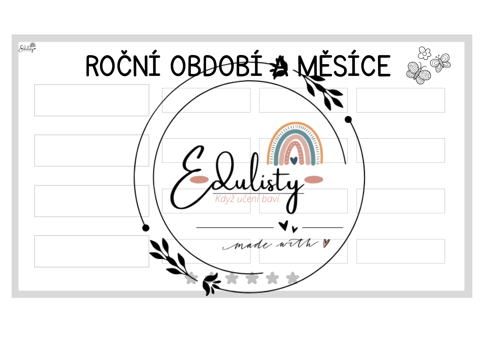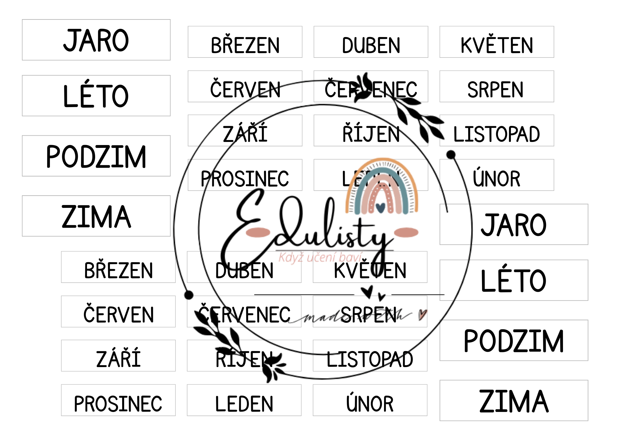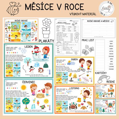Součástí sady je také pracovní list k procvičování měsíců a ročních období, přiřazovací kartičky a přehledy, které dětem pomáhají lépe se orientovat v čase. Materiál je vhodný pro výuku, domácí procvičování i jako součást portfolia žáka.
