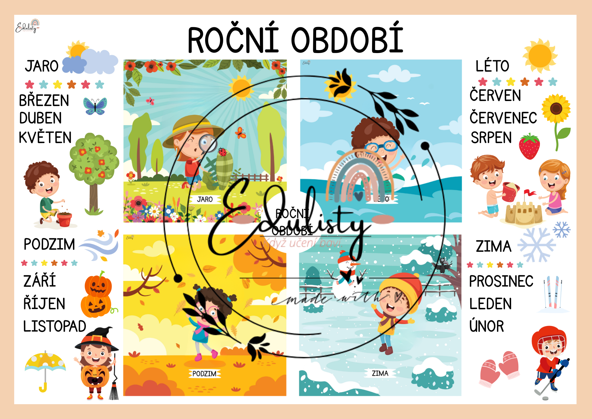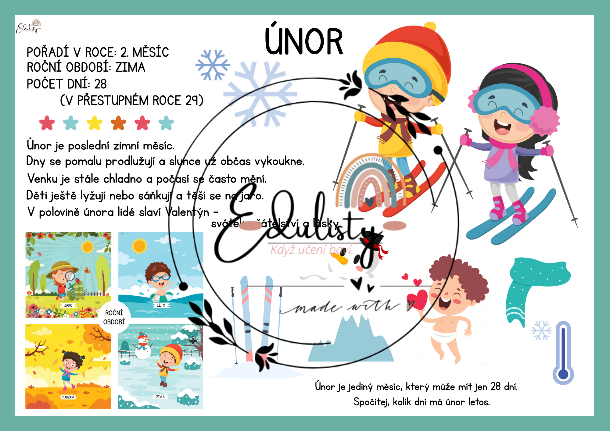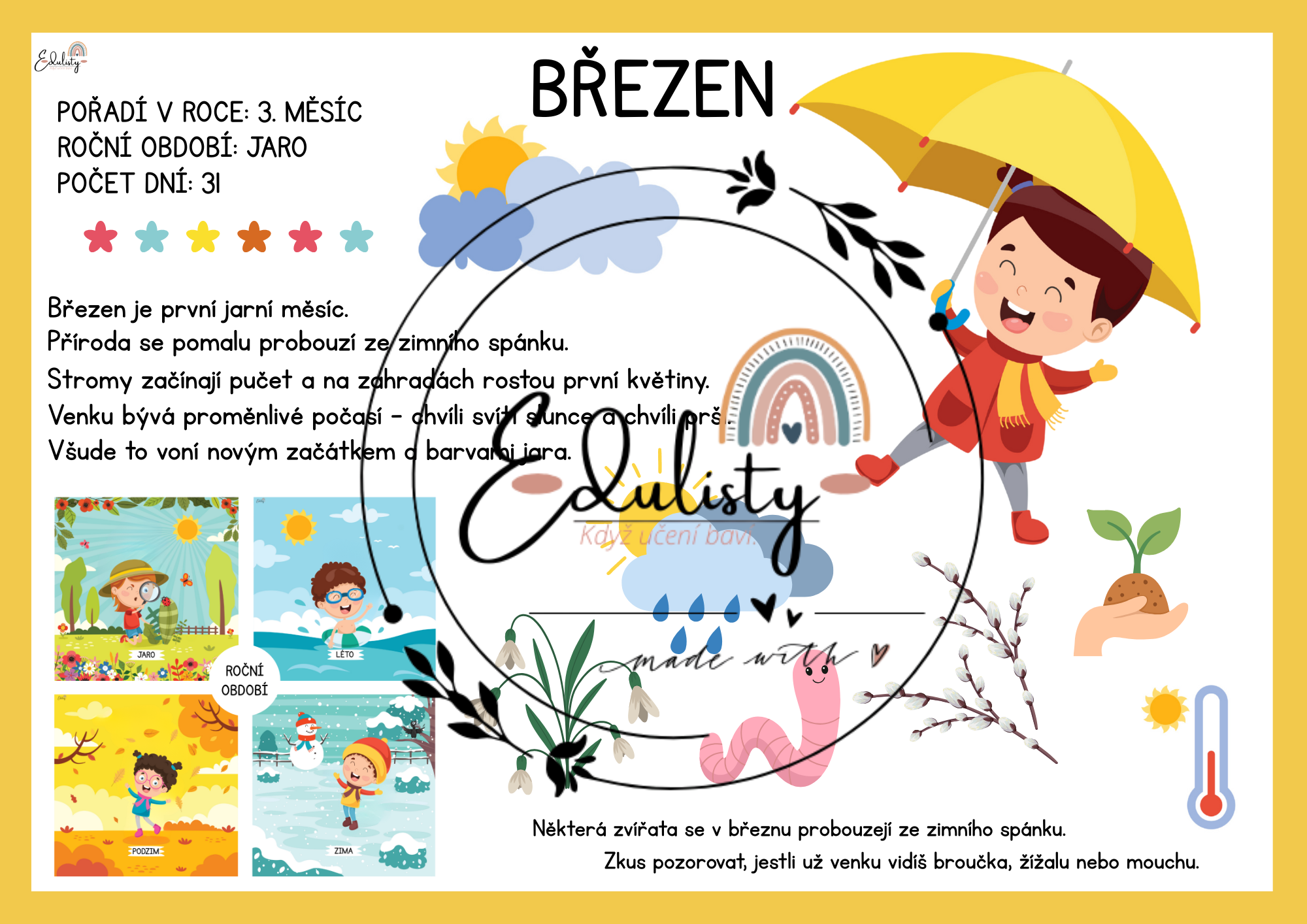 Součástí sady je také pracovní list k procvičování měsíců a ročních období, přiřazovací kartičky a přehledy, které dětem pomáhají lépe se orientovat v čase. Materiál je vhodný pro výuku, domácí procvičování i jako součást portfolia žáka.