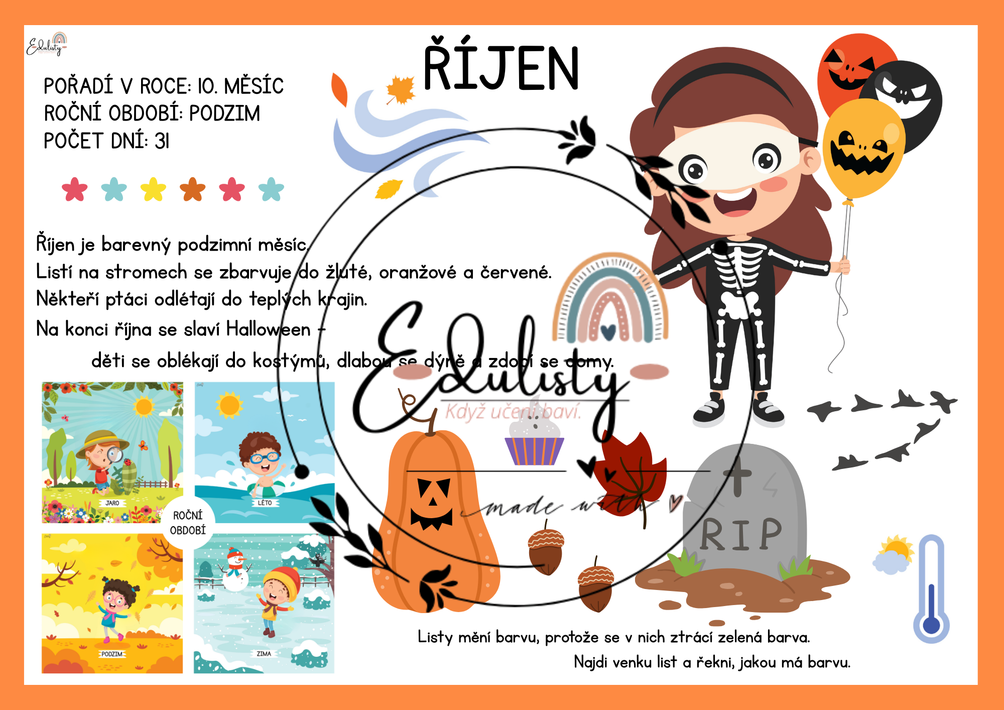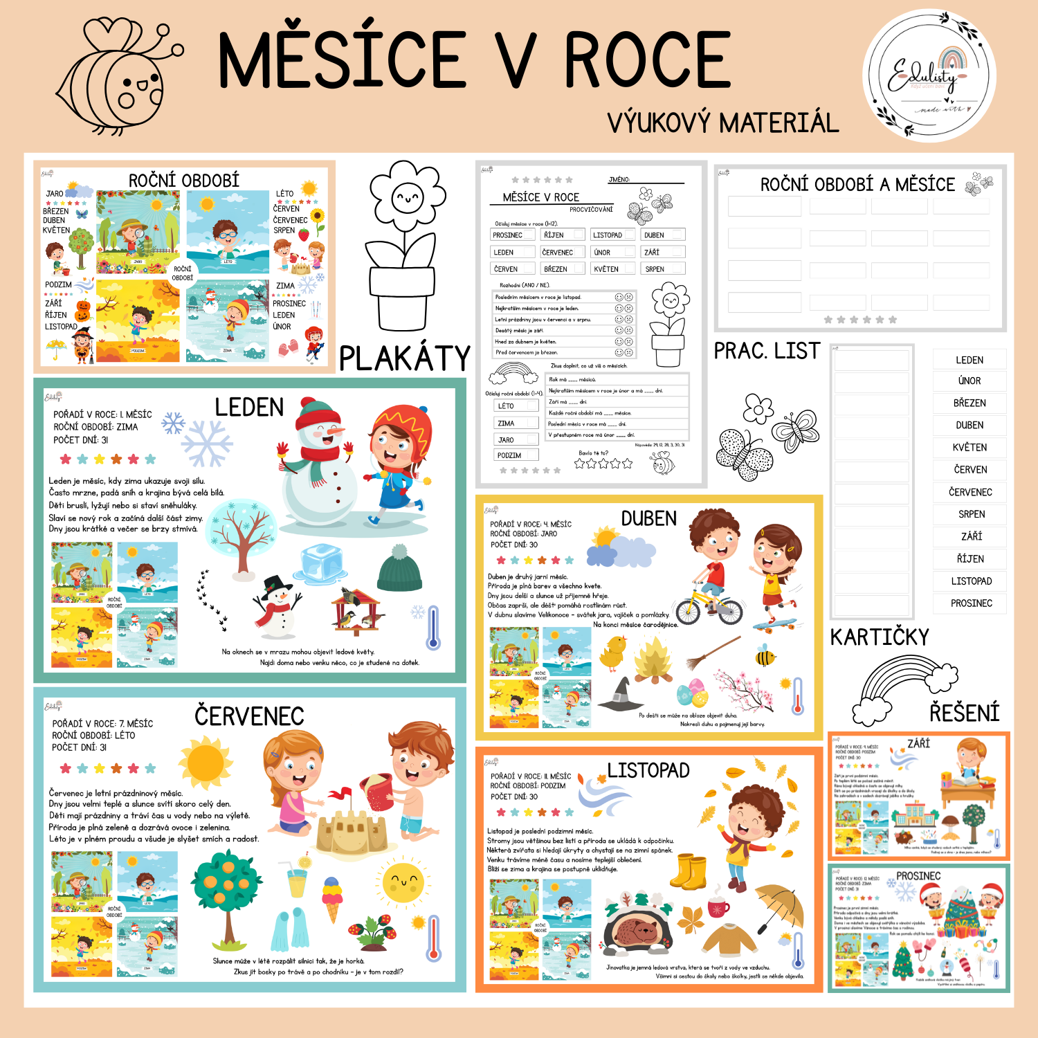 Tato sada rozšiřuje a doplňuje kolekci Roční období o podrobnější seznámení se všemi 12 měsíci v roce. Děti si pomocí přehledných plakátů, otázek a praktických úkolů upevní názvy měsíců, jejich pořadí, zařazení do ročních období, délku trvání i typické znaky.