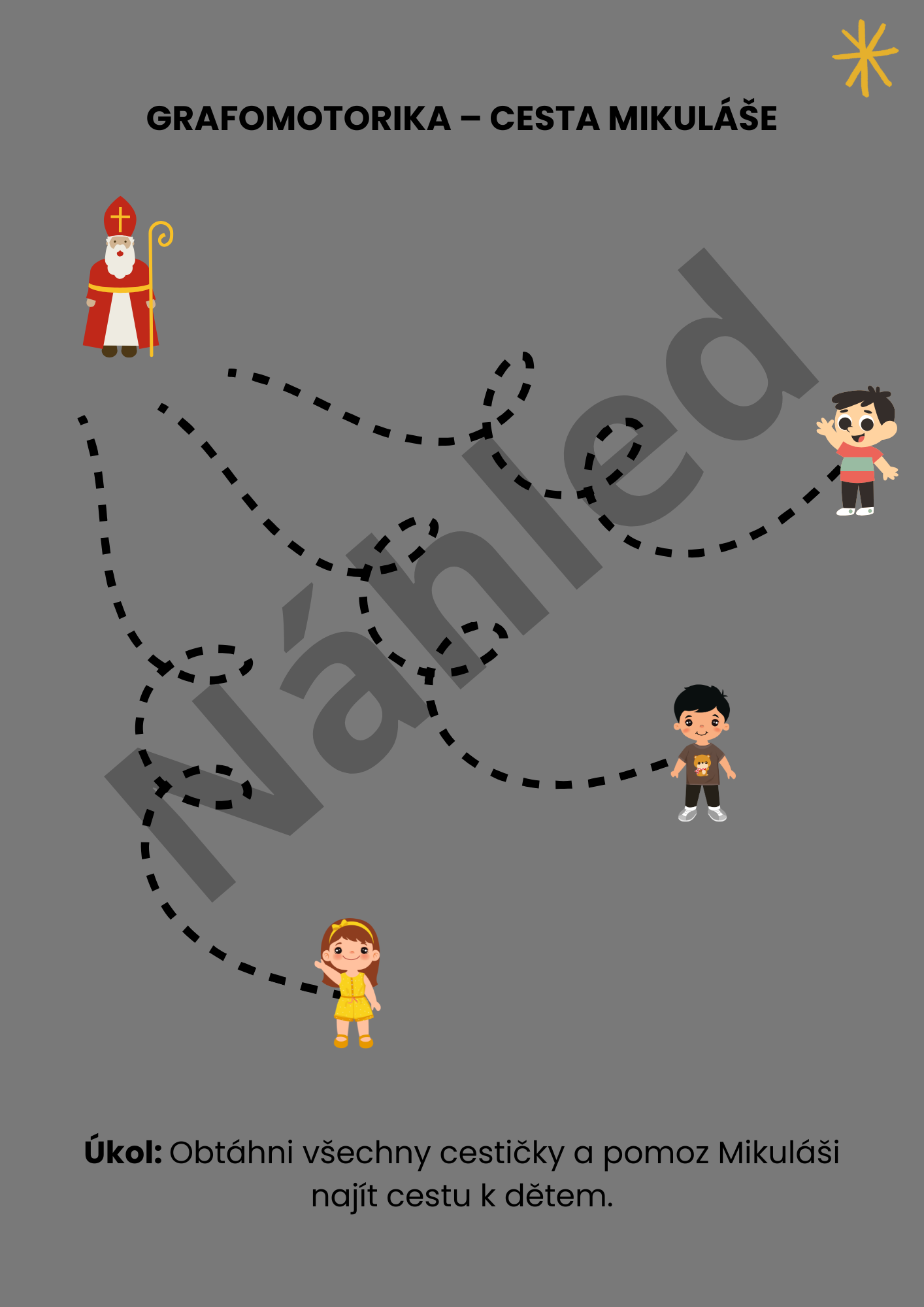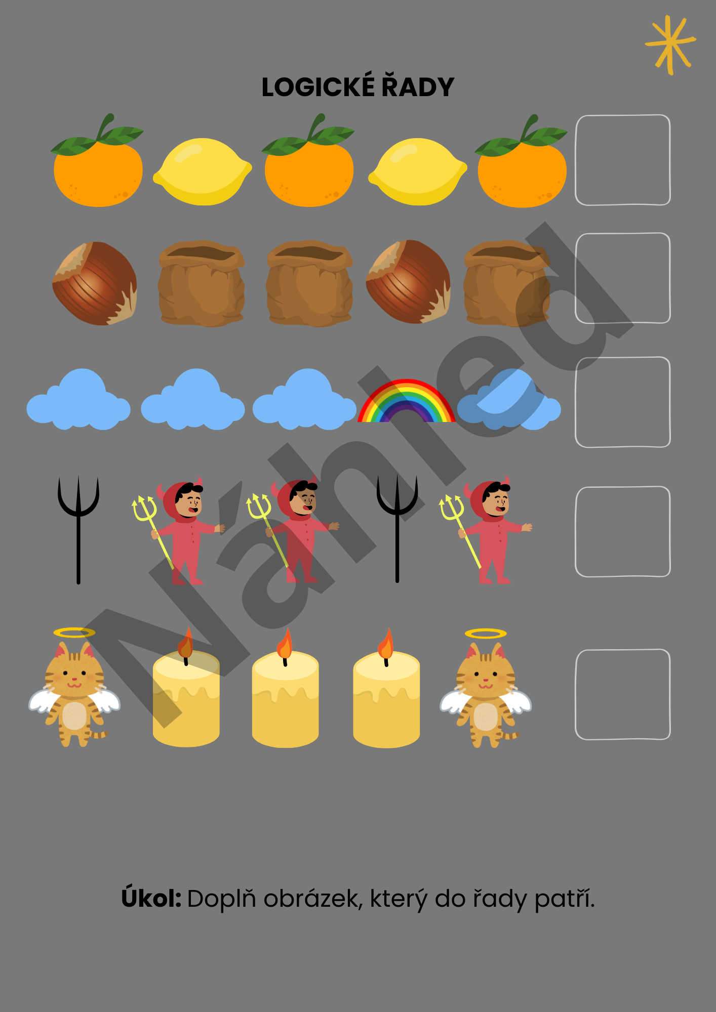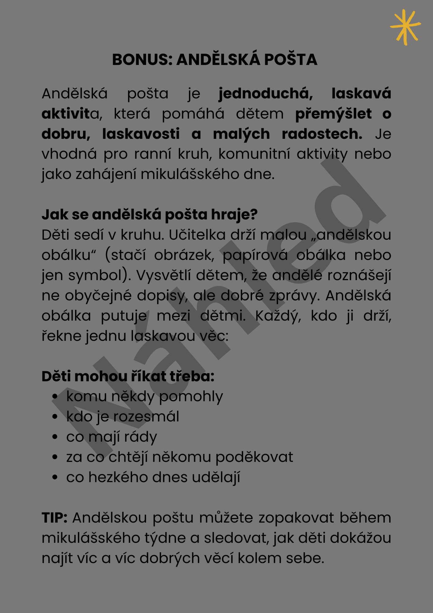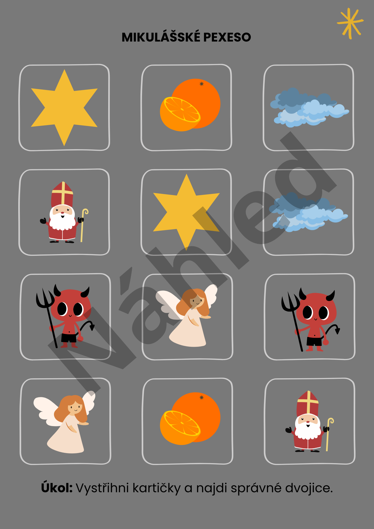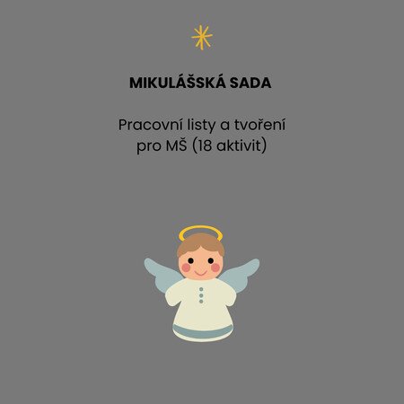 Najdete zde pracovní listy, grafomotoriku, třídění, pexeso, logické řady, dokreslovačky, tvoření, labyrint i bonusovou aktivitu Andělská pošta.