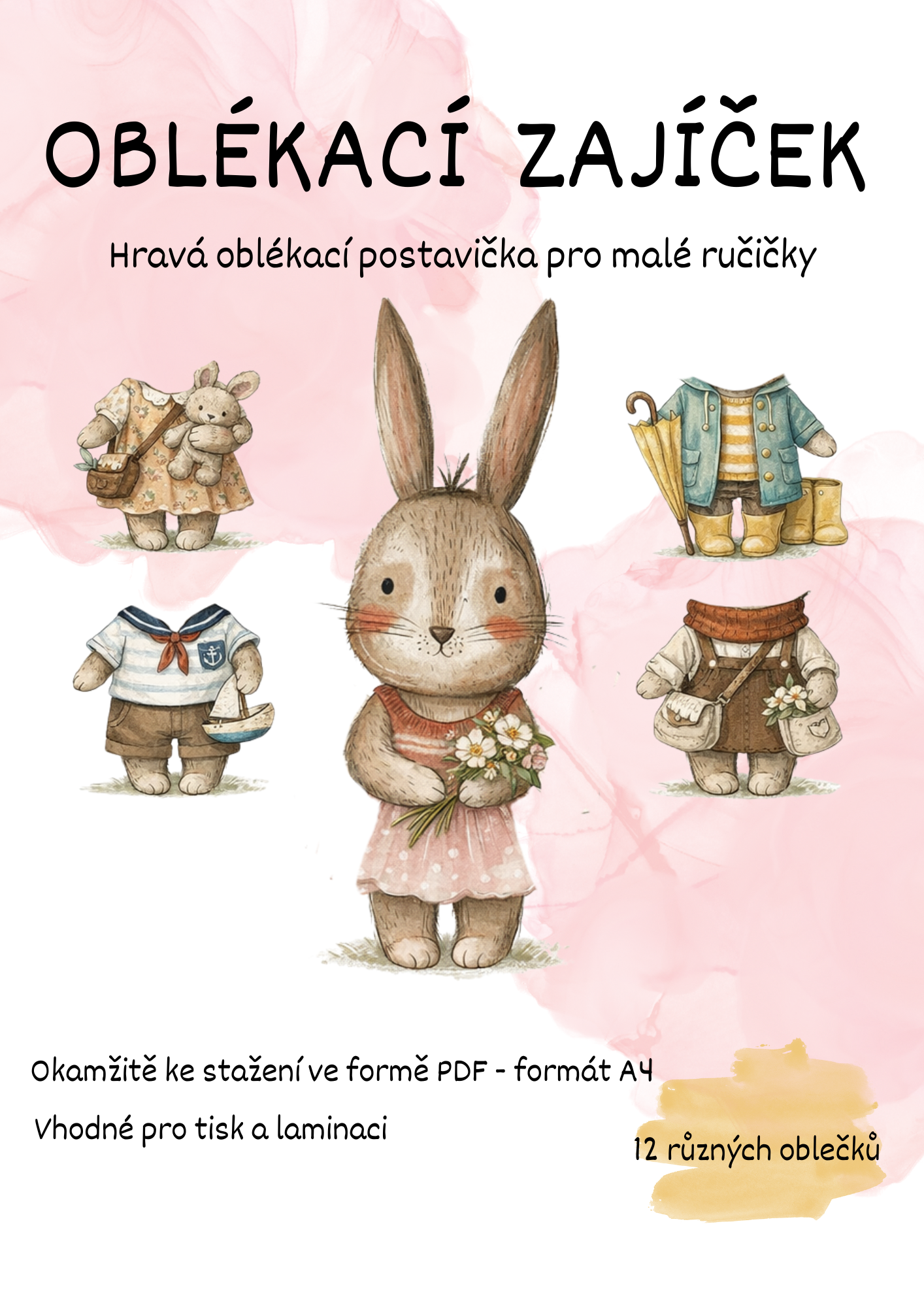 Materiál obsahuje oblékací postavičku zajíčka a 12 různých oblečků. Děti si procvičují jemnou motoriku, představivost a kreativitu při oblékání postavičky podle vlastního nápadu.