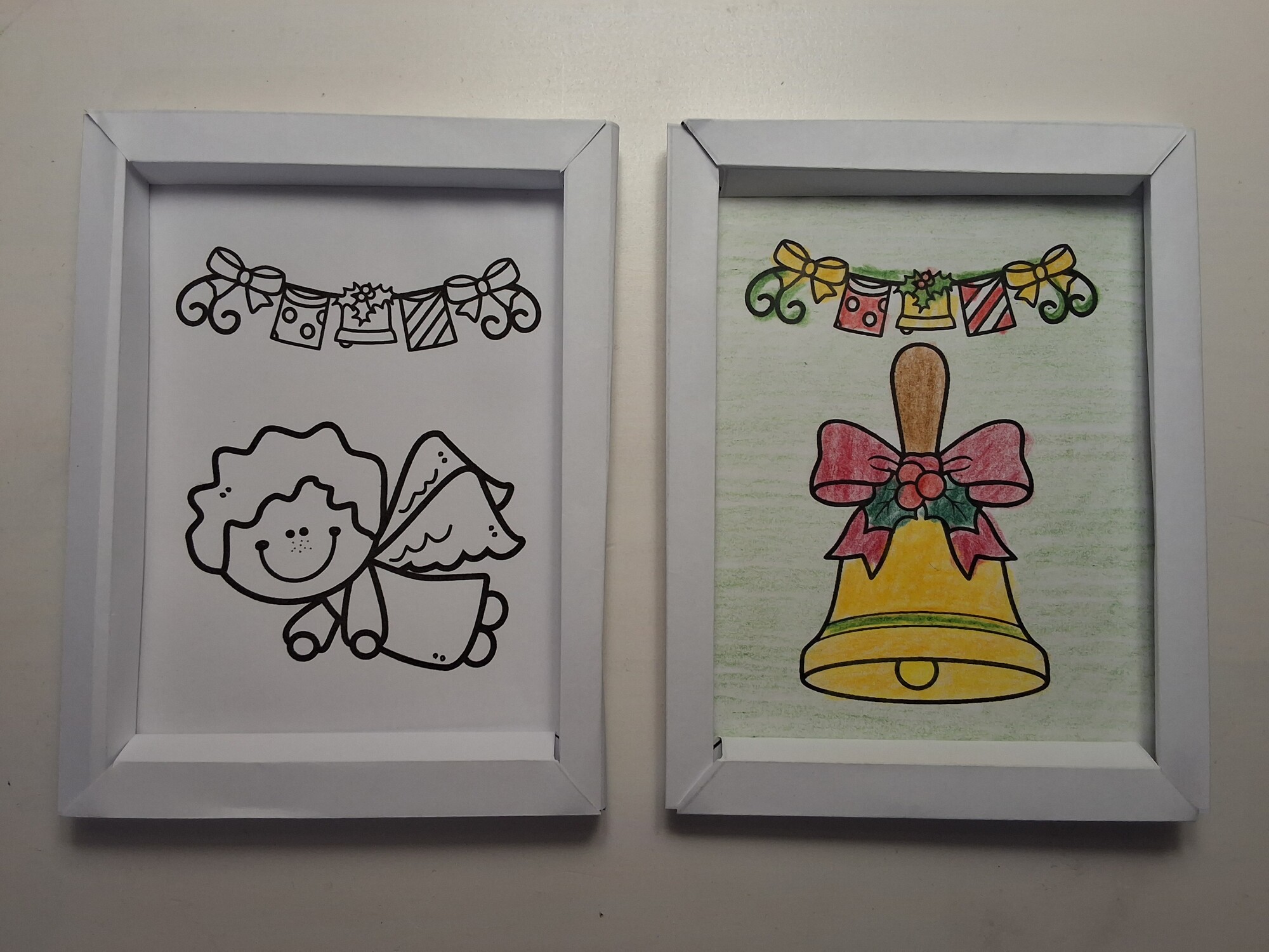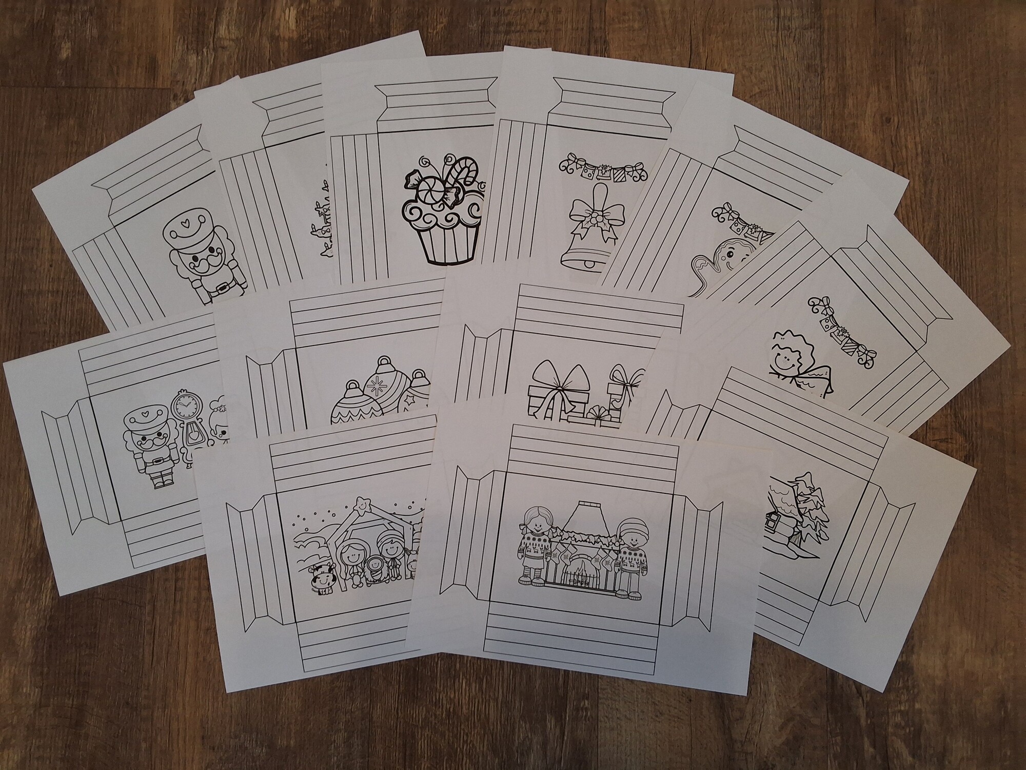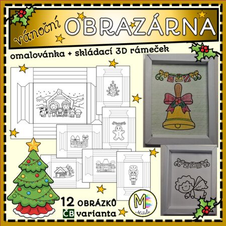 Soubor obsahuje 12 černobílých vánočních obrázků včetně propracovaných 3D rámečků. Děti si mohou vybrat z motivů, jako je betlém, vánoční stromeček, cukroví, perníček, zvoneček, chaloupka, dárečky a další typické symboly Vánoc. Rámeček je navržen tak, aby ho děti prvního stupně ZŠ zvládly složit samostatně. V mateřské škole mohou děti používat omalovánku a rámeček složí dospělý.