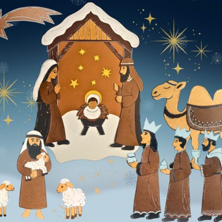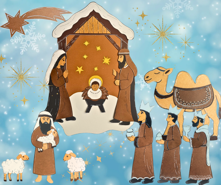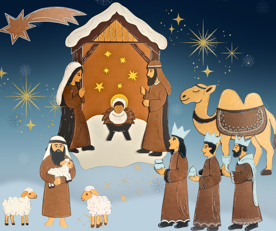 Jesličky s Marií a Josefem, malý Ježíšek, tři králové, pastýř, ovečky i velbloud – všechny postavy laděné do stejného stylu jako vesnička. Postavy mají výšku 25–30 cm.