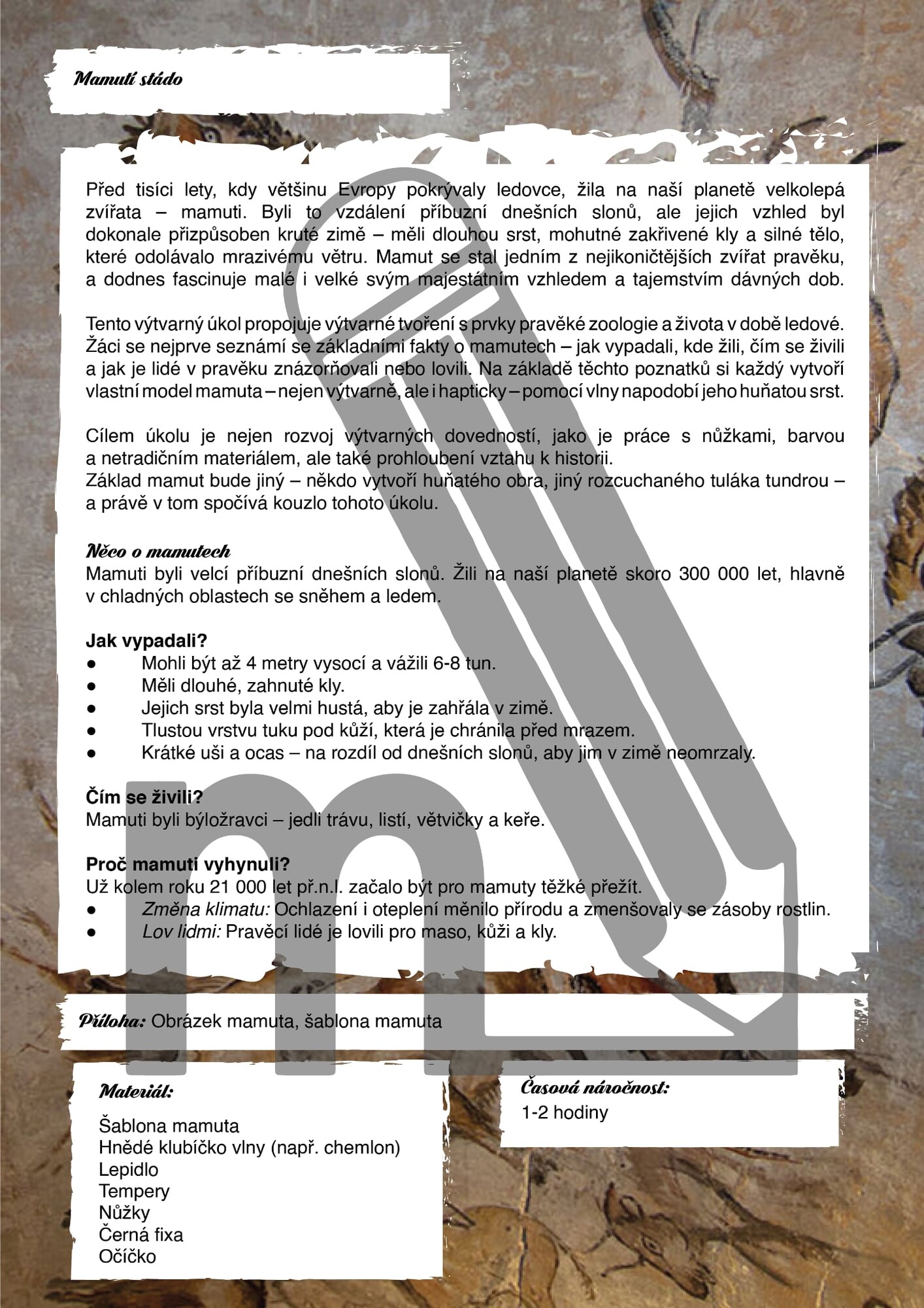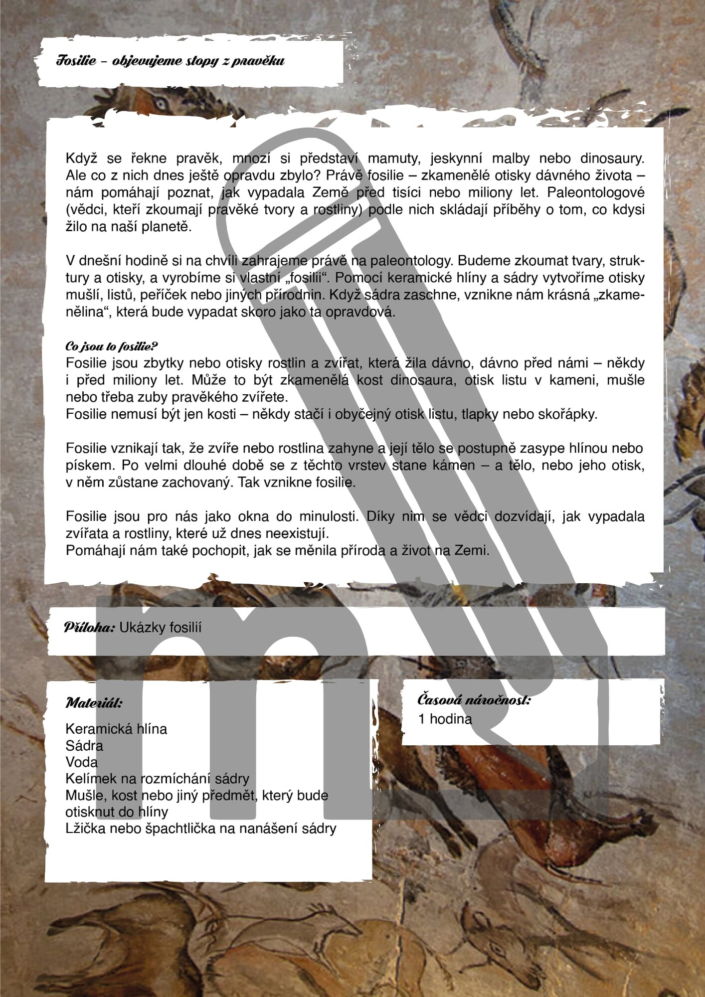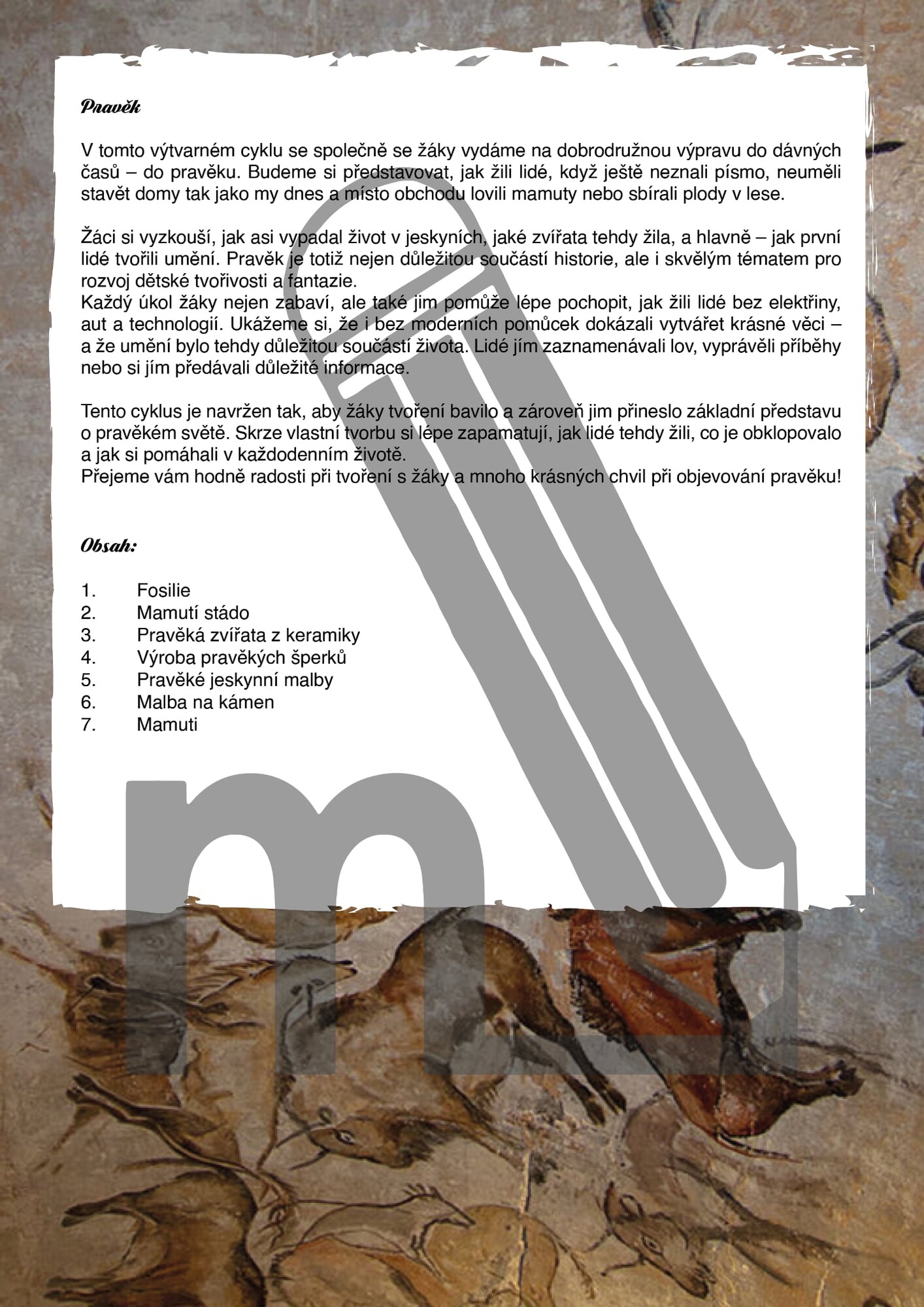 Tento materiál obsahuje sedm aktivit, které propojují výtvarné techniky s objevováním pravěkého světa. Žáci procvičí modelování, malbu i jednoduché tvoření z přírodních materiálů a přiblíží se každodennímu životu pravěkých lidí i jejich uměleckým projevům. Úkoly jsou jasně popsány a doplněny obrazovými ukázkami i praktickými šablonami. Vše ozkoušeno v praxi s velikým úspěchem.