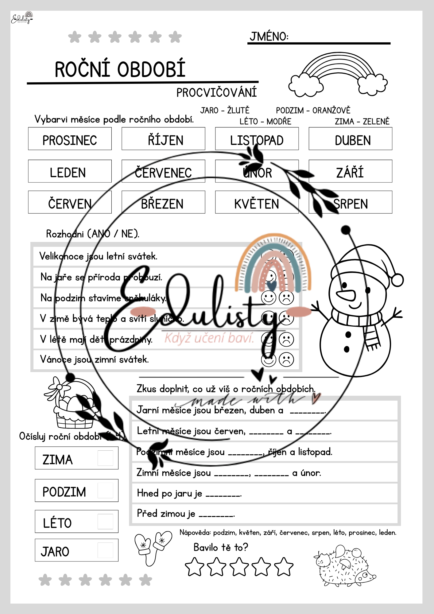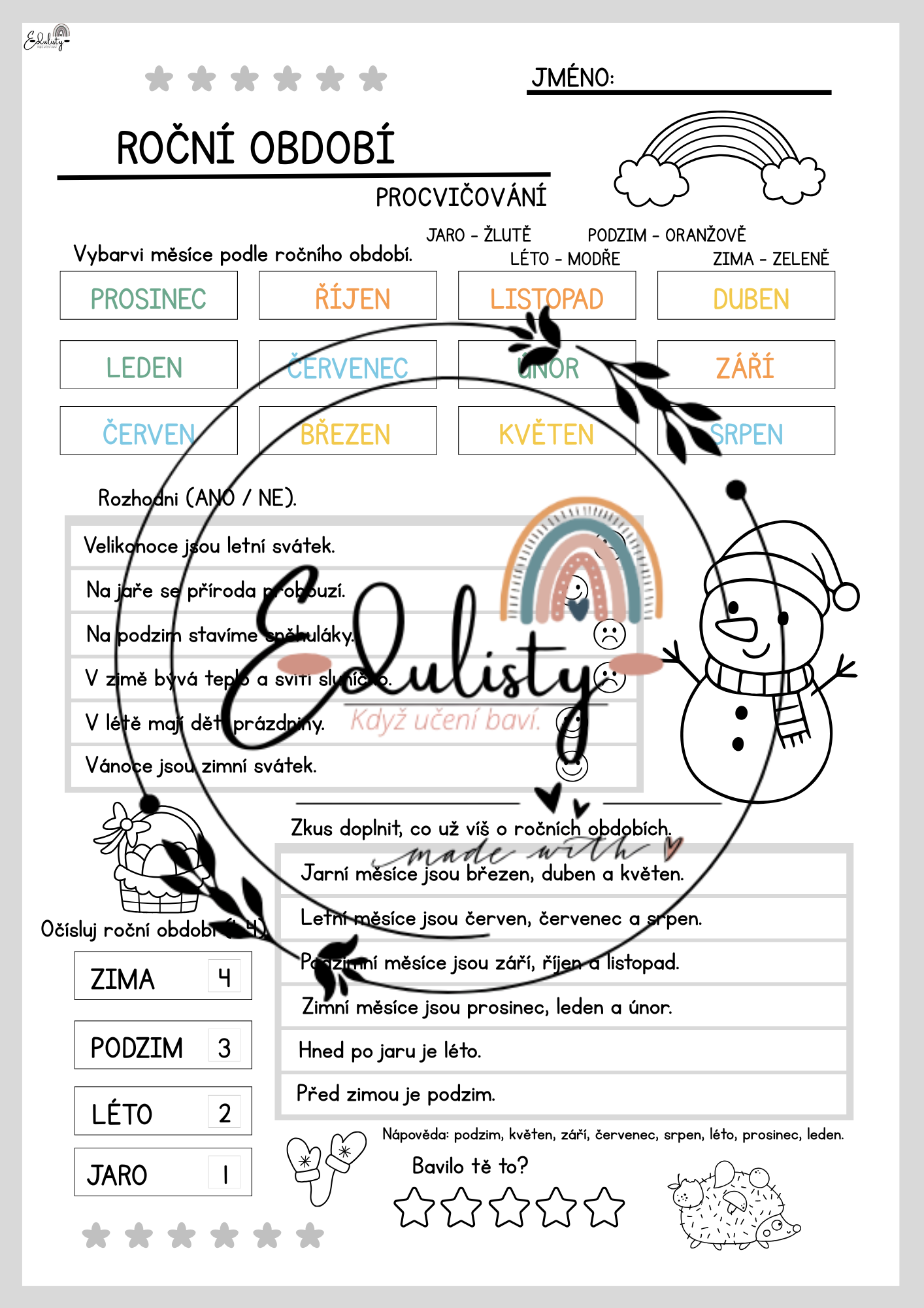 Tento výukový materiál seznamuje děti se čtyřmi ročními obdobími a jejich typickými znaky. Pomocí přehledných plakátů, ilustrací a procvičovacích aktivit si děti upevní základní orientaci v průběhu roku a změnách v přírodě.
