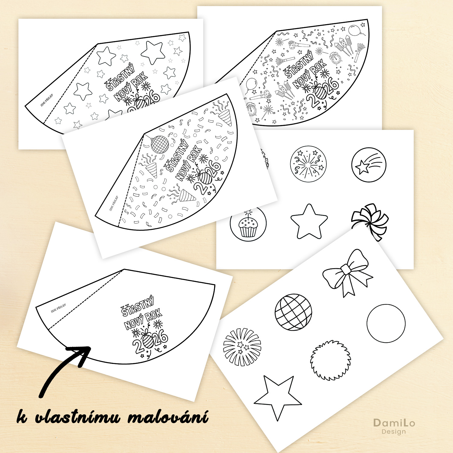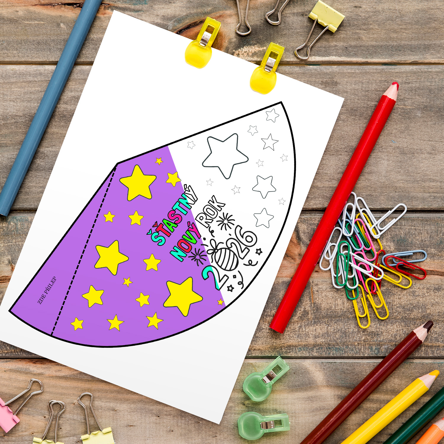 Zábavné vybarvovací šablony přinášejí prostor pro tvořivost, fantazii a oslavu nového začátku. Děti si samy vytvoří originální párty čepičky – ideální aktivita na prosincové tvoření ve školce, škole, družině i doma.