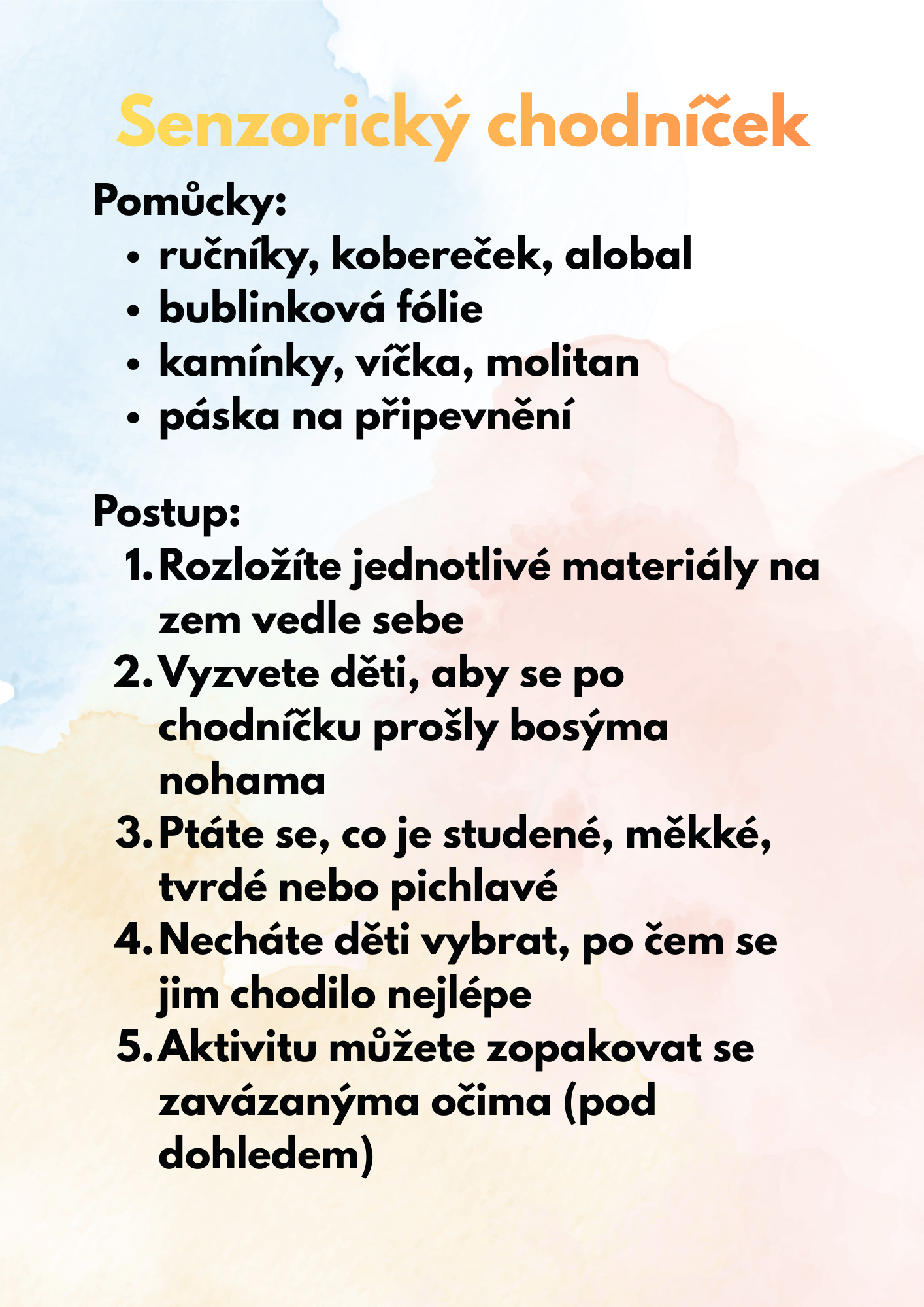 Tento PDF materiál obsahuje 60 senzorických aktivit, které pomáhají dětem rozvíjet smysly, pohyb, soustředění i zklidnění.