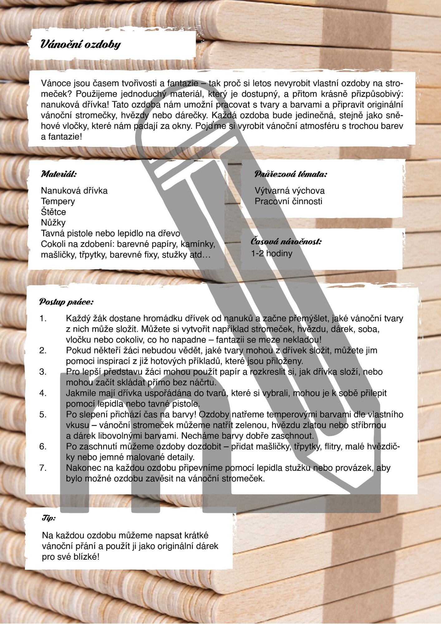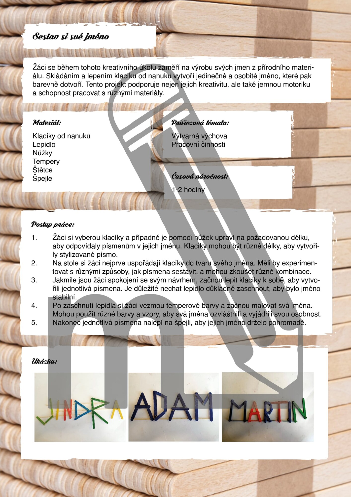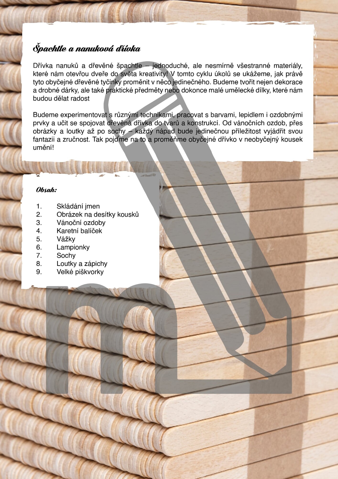 Soubor přináší devět tvořivých aktivit pro žáky 1. i 2. stupně ZŠ, které využívají nanuková dřívka a dřevěné špachtle jako hlavní výtvarný materiál. Děti si vyzkouší skládání vlastního jména, obrázek rozřezaný na malé části, výrobu loutek nebo tvorbu vánočních ozdob. Nechybí ani další hravé projekty, které podporují kreativitu, konstrukční myšlení i jemnou motoriku.
