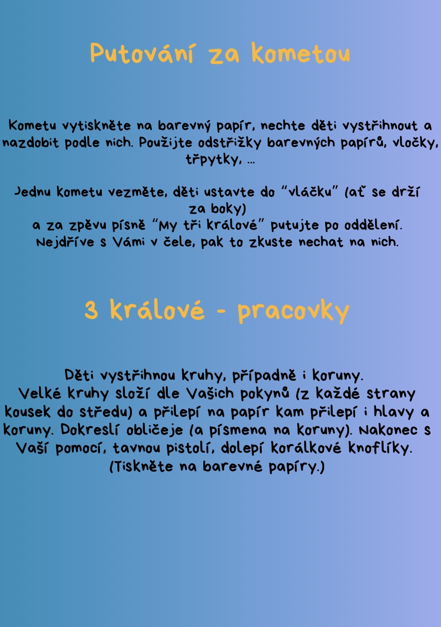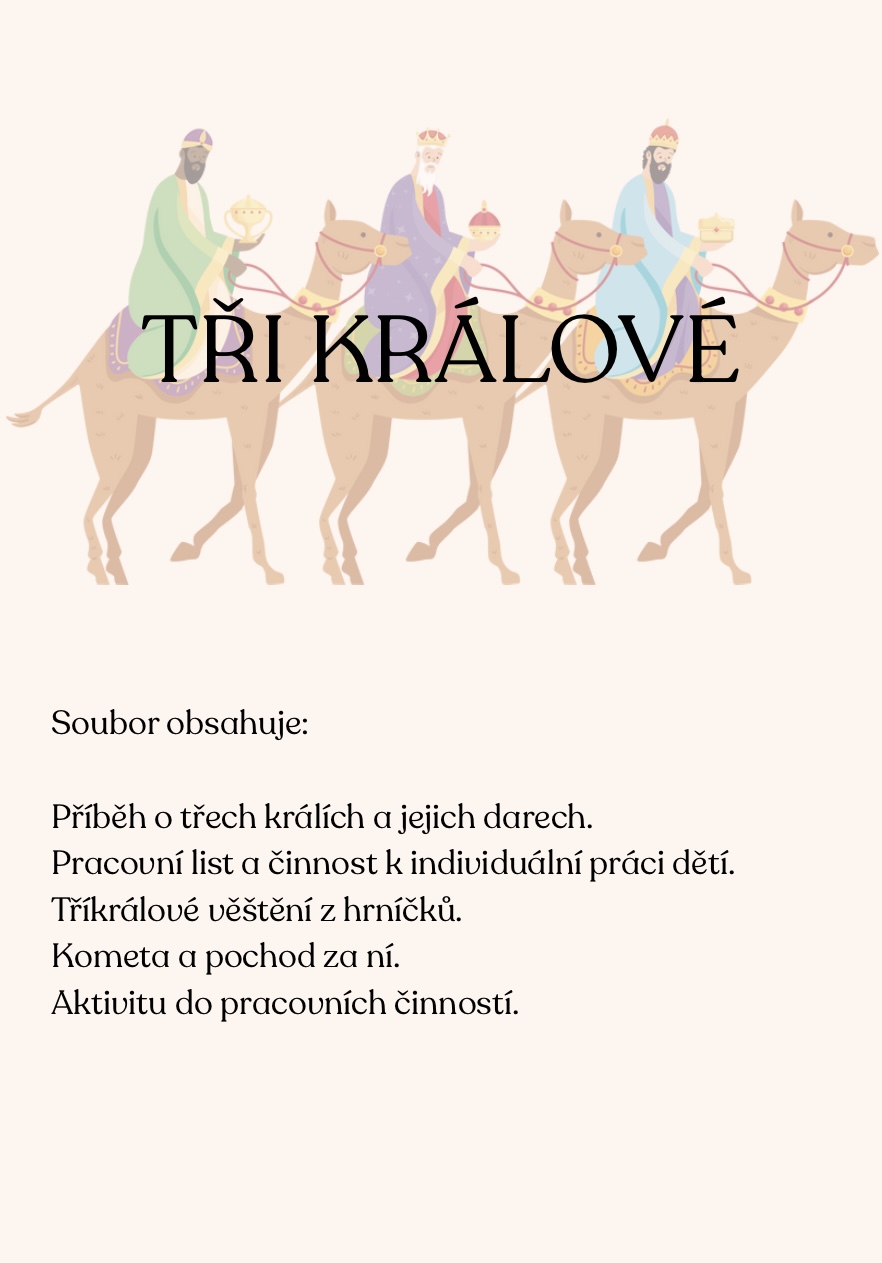 Aktivity, které přiblíží příběh Tří králů. Obsahuje činnosti spojené s touto tradicí, včetně jedné ne tak známé, a to ,,věštění z hrníčků”. Tuto tradici už dnes moc lidí nedodržuje, přesto, že je velice zajímavá.