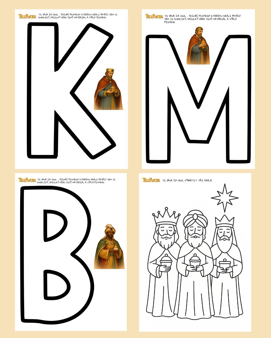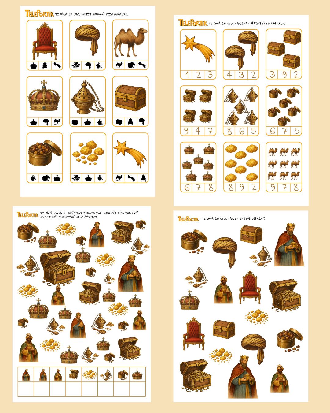 Tematický vzdělávací materiál Tři králové nabízí pestrý soubor pracovních listů a kartiček inspirovaných tradičním příběhem o Kašparovi, Melicharovi a Baltazarovi. Materiál je navržen tak, aby hravou formou rozvíjel klíčové dovednosti dětí ve věku 3–7 let a umožňoval snadnou diferenciaci obtížnosti.