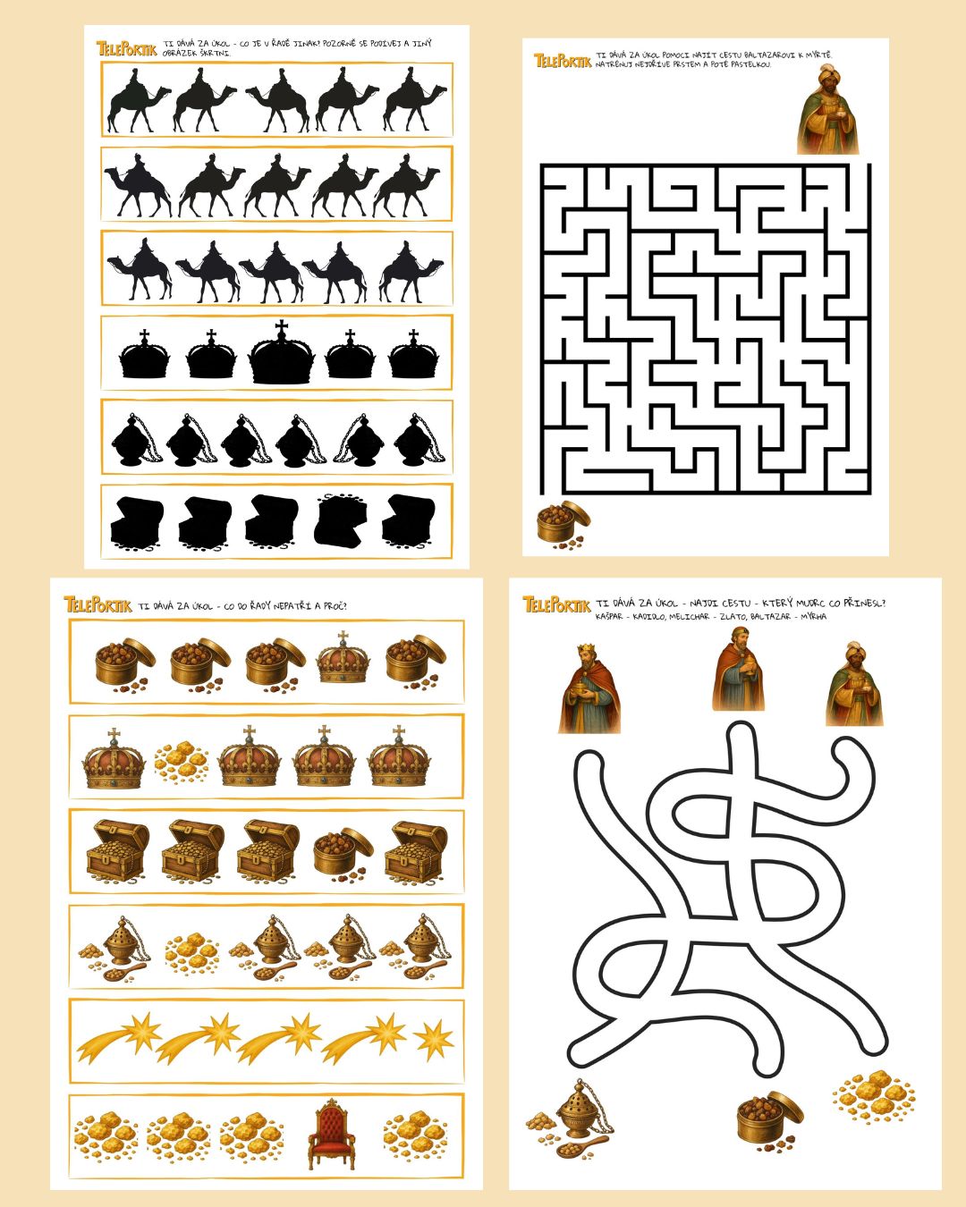 - barevné bludiště (Baltazar – zelená, Kašpar – červená, Melichar – žlutá),