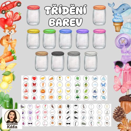 Úkolem dětí je určit barvu každého obrázku a přiřadit ho ke sklenici s odpovídající barvou. Sklenice jsou označeny barvami: červená, oranžová, žlutá, zelená, modrá, fialová, růžová, hnědá, černá, šedá a bílá. Aktivita pomáhá dětem procvičit rozpoznávání barev a jejich správné třídění. Po vytisknutí doporučuji zalaminovat. Lze nalepit i suchý zip.