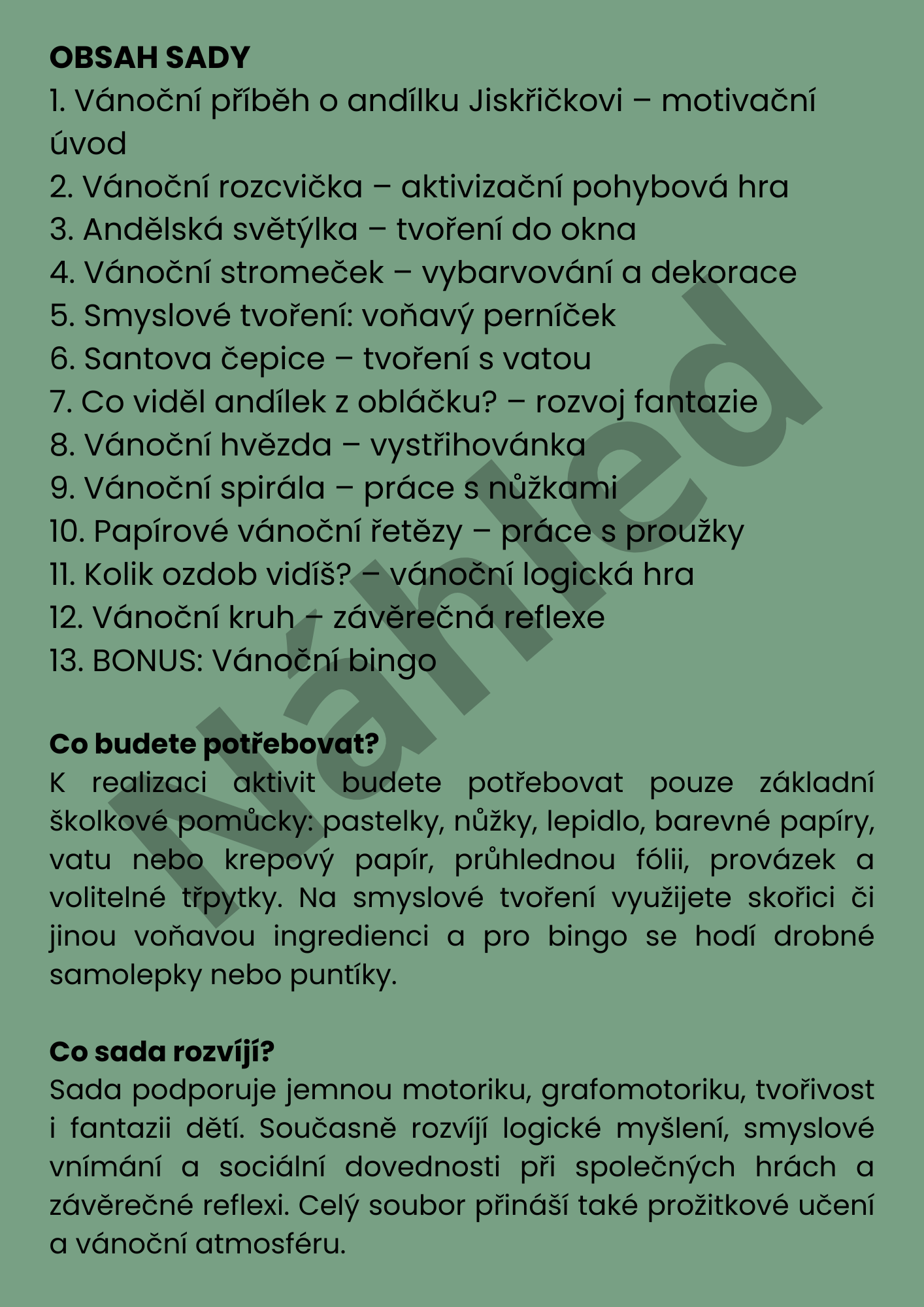 Originální příběh o andílku Jiskřičkovi provází děti tvořením a vytváří silnou motivační linku, která celou dílničku spojuje. Najdete zde také závěrečnou aktivitu „Vánoční kruh“, kde mohou děti zpracovat své dojmy a sdílet radost. Součástí je i bonusové vánoční bingo.